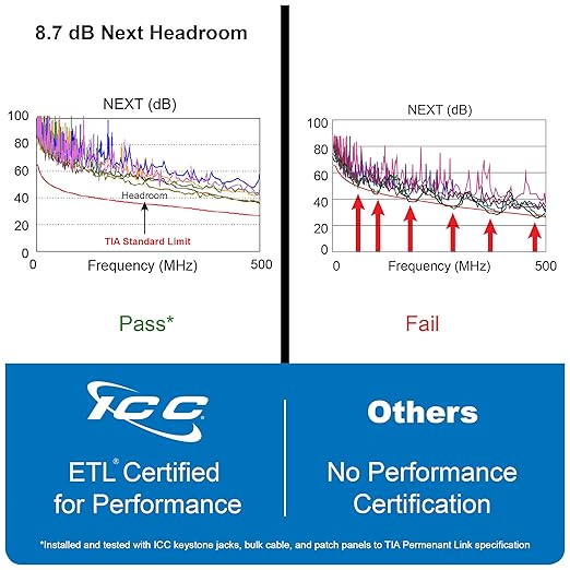 - COMPLETE CABLING SYSTEM: Install ICC CAT6A Keystone Jacks with ICC CAT6A Cables, CAT6A Patch Panels, and CAT6A Patch Cables to achieve both Permanent Link and Channel Link specifications for end-to-end network performance. This configuration provides maximum NEXT headroom, exceeding ANSI/TIA-568 Category 6A requirements for enhanced crosstalk cancellation, reduced return loss, and improved network reliability. Backward compatible with Cat6, Cat5e and Cat5 components and cabling.