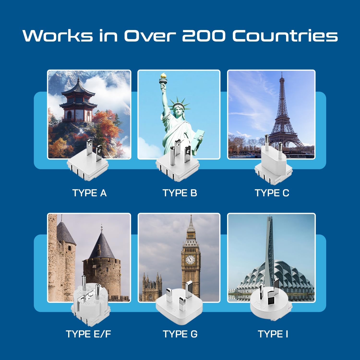 - Ceptics World-Way Includes 6 adapters-Europe (Type C), UK (Type G), US (Type B), Australia/China (Type I), Germany/France (Type E/F), Japan(Type A) compatible outlets in most of Europe, Asia and more. Other SWADAPT attachments sold separately.