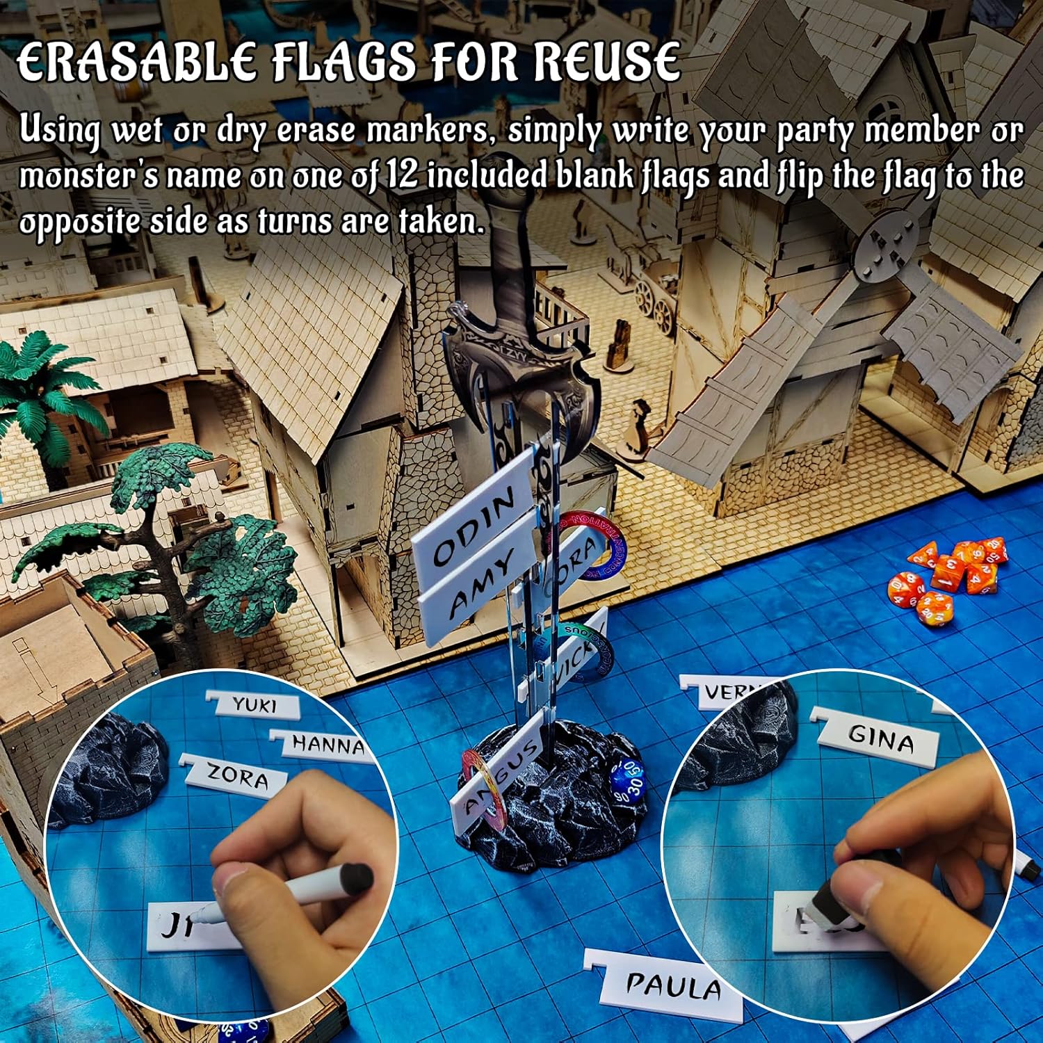 - ERASABLE FLAGS FOR REUSE - Using wet or dry erase markers, simply write your party member or monster's name on one of 12 included blank flags and flip the flag to the opposite side as turns are taken.