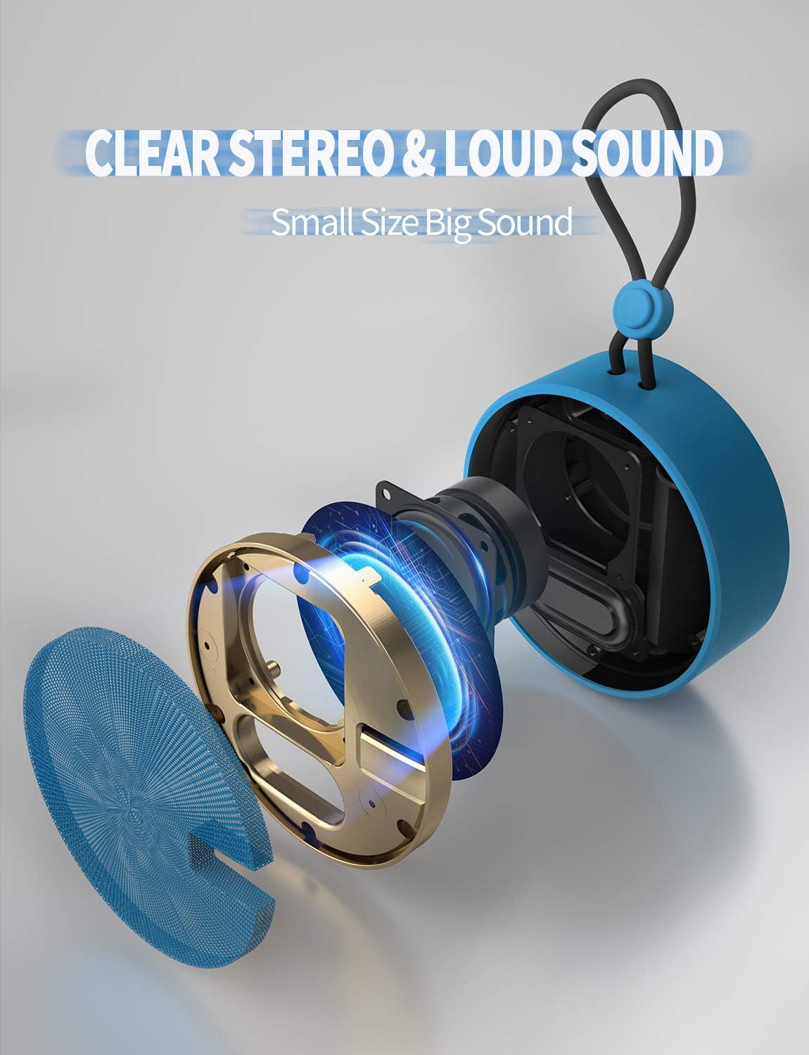 - 【IP67 WATERPROOF EVEN FULLY SUBMERSIBLE】Can be fully immersed up to 1 meter for about 30 minutes underwater. Featuring shock-absorbent materials, C12 shockproof portable travel speaker is primed for every type of weather and terrain, hiking, camping, running, and more. Perfect for Kayaking, boating, paddle boarding, and fishing. No worries about weather and outdoor condition, making this shower Bluetooth speaker the perfect companion for the pool beach trail, or shower.
