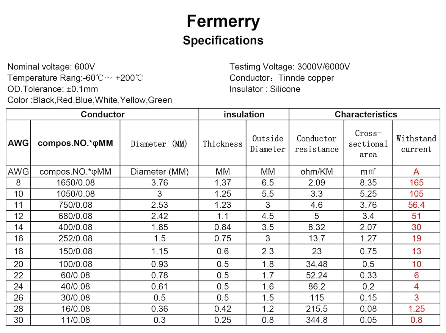 - Application-Fermerry silicone wires are widely used in LED lighting, electrical and electrical equipment, aluminum batteries, RC batteries, model wiringz harnesses, instrumentation internal connections, large transformers and motors connecting equipment with wires,etc
