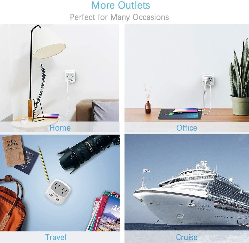 - Multi Plug Outlet Extender: 1 outlet can extend to charge 4 device; 2 USB ports could detect the charging devices automatically and provide optimum fast charging speed up to 2.4A (max)for cell phone, tablet; No surge protection design, no cords, subitale for Cruise Ship Accessories