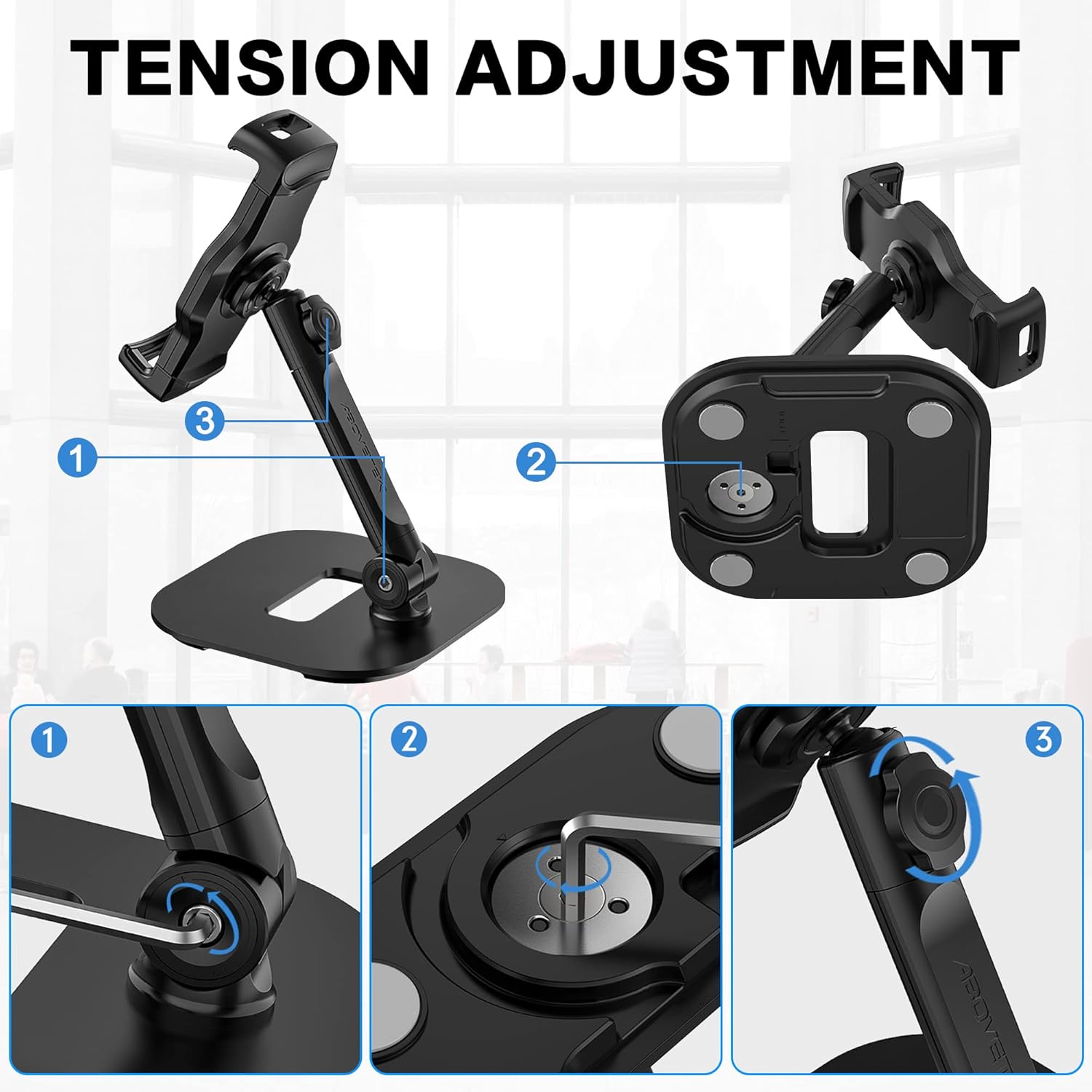 AboveTEK Upgraded Desktop Tablet Stand, 360° Swivel Tablet & Phone Desk Mount Holders for Any 4.7''-13.5'' Display iPad/Cell Phones, Stylish & Sturdy Stands for Store Office Showcase Reception (Black)