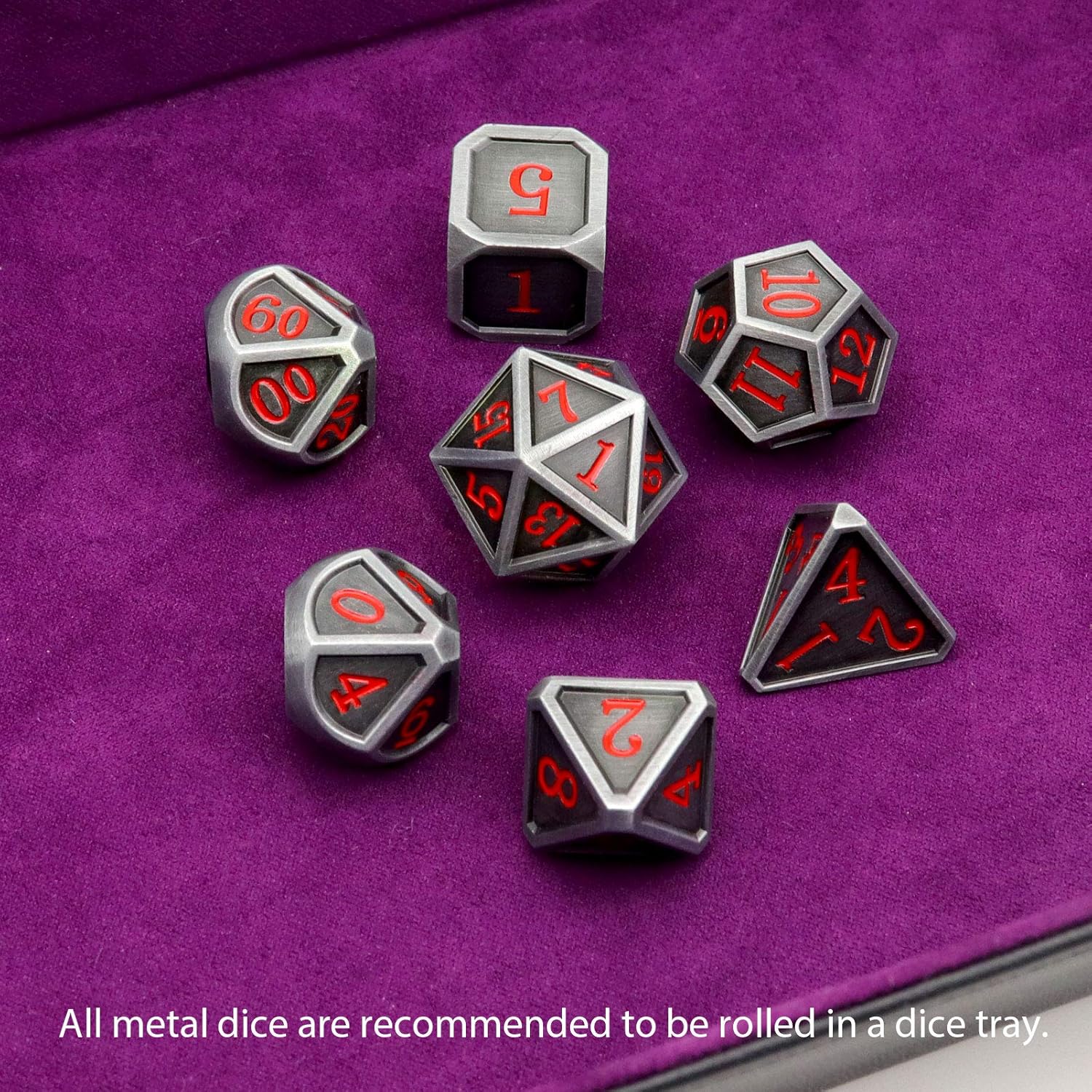 - Metal DND Dice Set W/ Gift Metal Case: One set dice total 7 pcs including D4, D6, D8, D10, D12, D21 and D%.