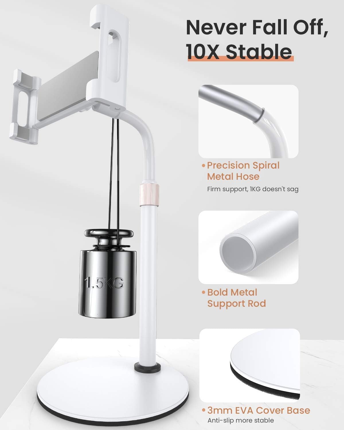 - ✅NEVER FALL OFF: LISEN Tablet Stand Holder has been upgraded from three aspects: strengthen metal silica gel clip, sturdy and thickened all-metal rod, upgraded round base with thickened EVA pad, which makes it super stable to support all Tablets.