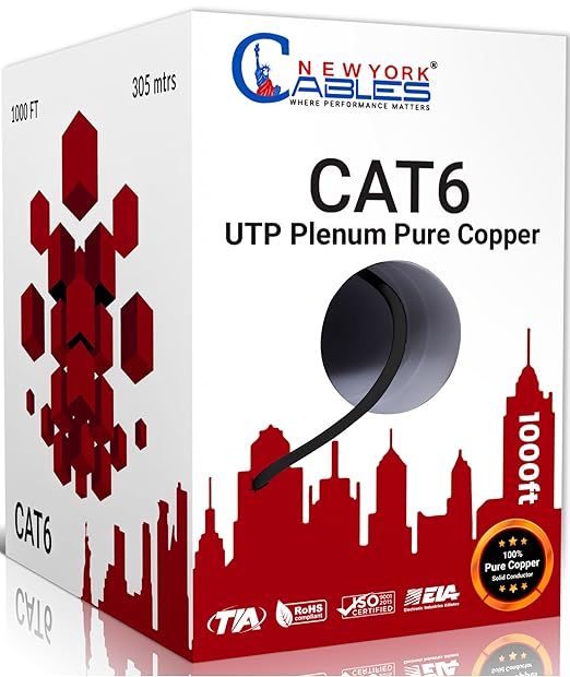 NewYork Cables CAT6 Plenum Cable 1000ft | 100% Pure Copper, UTP, 550MHz, 23AWG, 4Pair 10GB Ethernet Cable, Certified CMP-Rated Bulk Cat 6 for Networking & Gaming (1000ft, Pure Copper,Black)