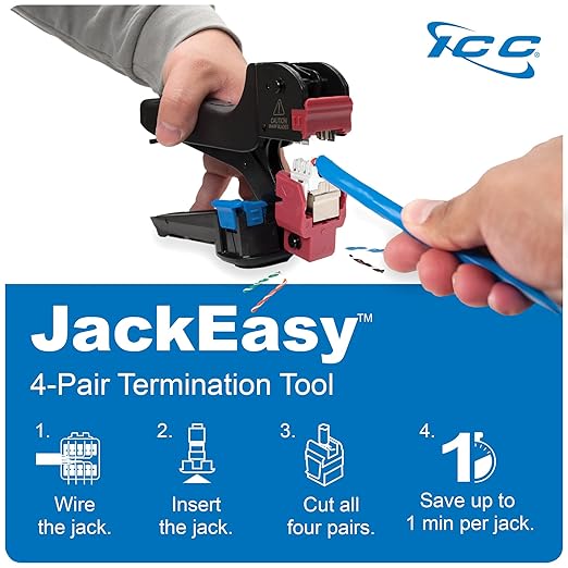 - FAST 4-PAIR TERMINATION: Built to work with ICCβs JackEasy 4-Pair Termination Tool (SKU ICACSPDTEH), enabling termination of all four pairs in a single squeeze. Features phosphor bronze alloy IDC pins, designed to withstand 100+ re-terminations for reliable and durable performance. Supports over 750 plug-to-jack insertion cycles for extended usability, with compatibility for RJ45 (8P8C) patch cables.