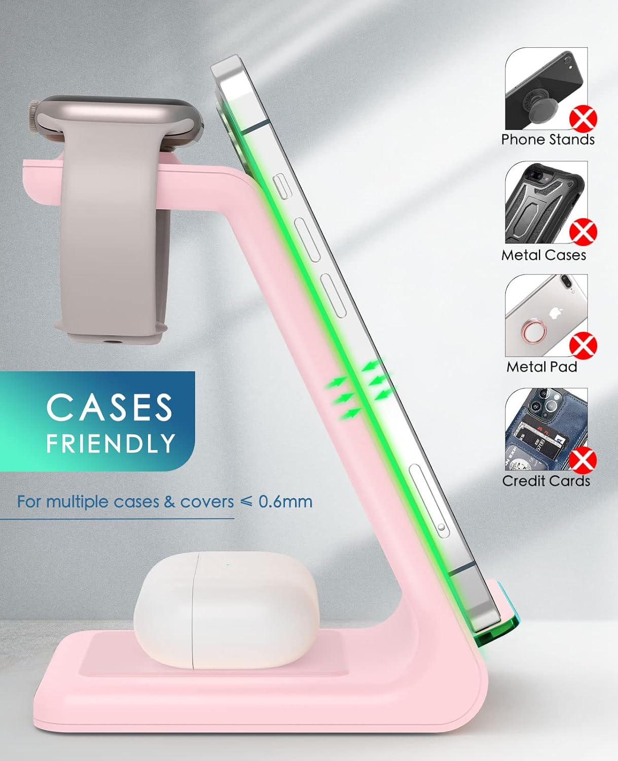 - 🔋【𝟯-𝗶𝗻-𝟭 𝗪𝗶𝗿𝗲𝗹𝗲𝘀𝘀 𝗖𝗵𝗮𝗿𝗴𝗶𝗻𝗴 𝗦𝘁𝗮𝘁𝗶𝗼𝗻】You can charge your apple products simultaneously through this 3-in-1 iphone charging station. It charges your iPhone, Apple Watch, and AirPods at the same time. The wireless charging stand outputs up to 10W for Phones, 5W for AirPods 2 (wireless case)/Pro, and 3W for Apple Watch