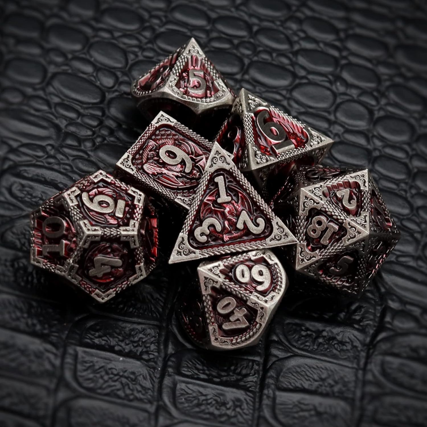 - Unique Dragon Metal Dice Set Black: Cool dragon dnd dice with fire-breathing scenes? Here they come! The matt black metal dice set are engraved with three layers, dragon scale, dragon fire balls, wings, claws, tails and even its throne! A must-have to be envy of the table.