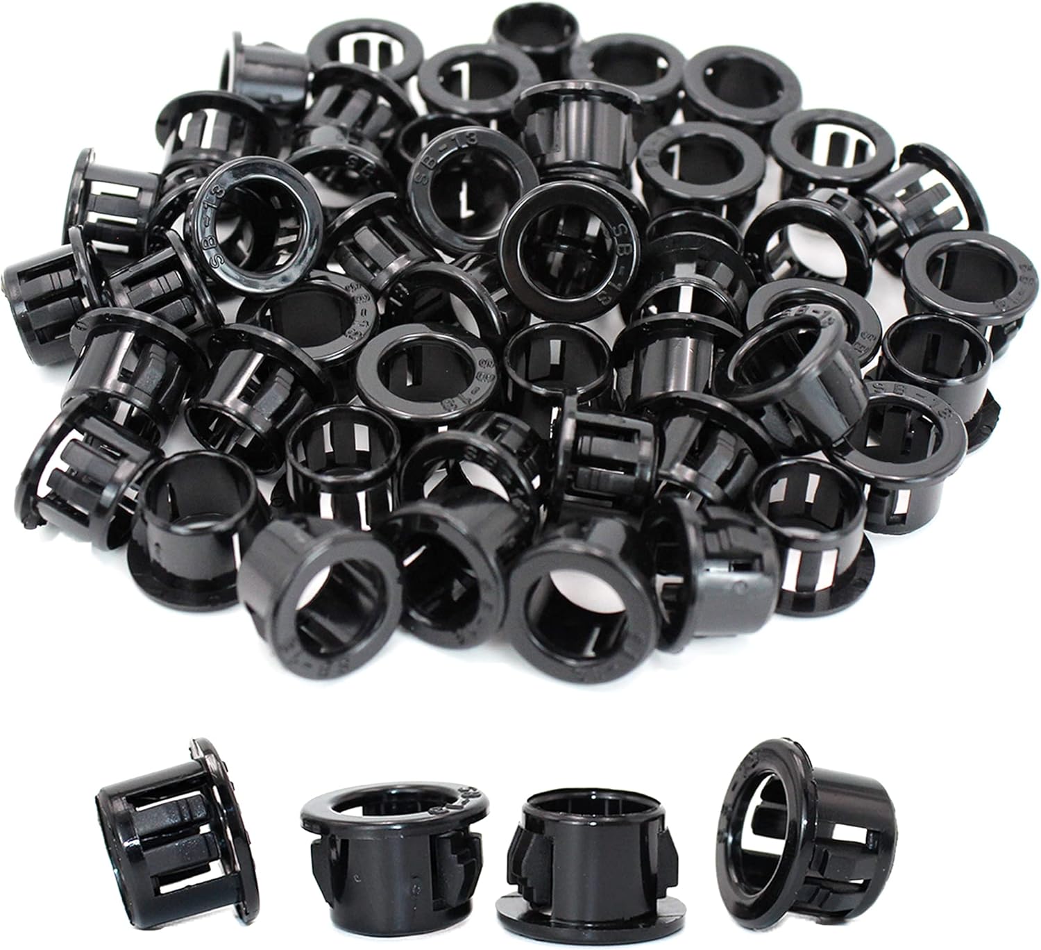 - PACKAGE&SIZE: You will got 50pcs of black snap-in knockout bushing for this package with Mounting Dia: 1/2"; Fits hole diameter: 0.51~0.53in(12.9~13.5mm); Inner Dia: 0.39in(10mm); Outer Dia: 0.65in(16.4mm); Height: 0.41in(10.52mm)