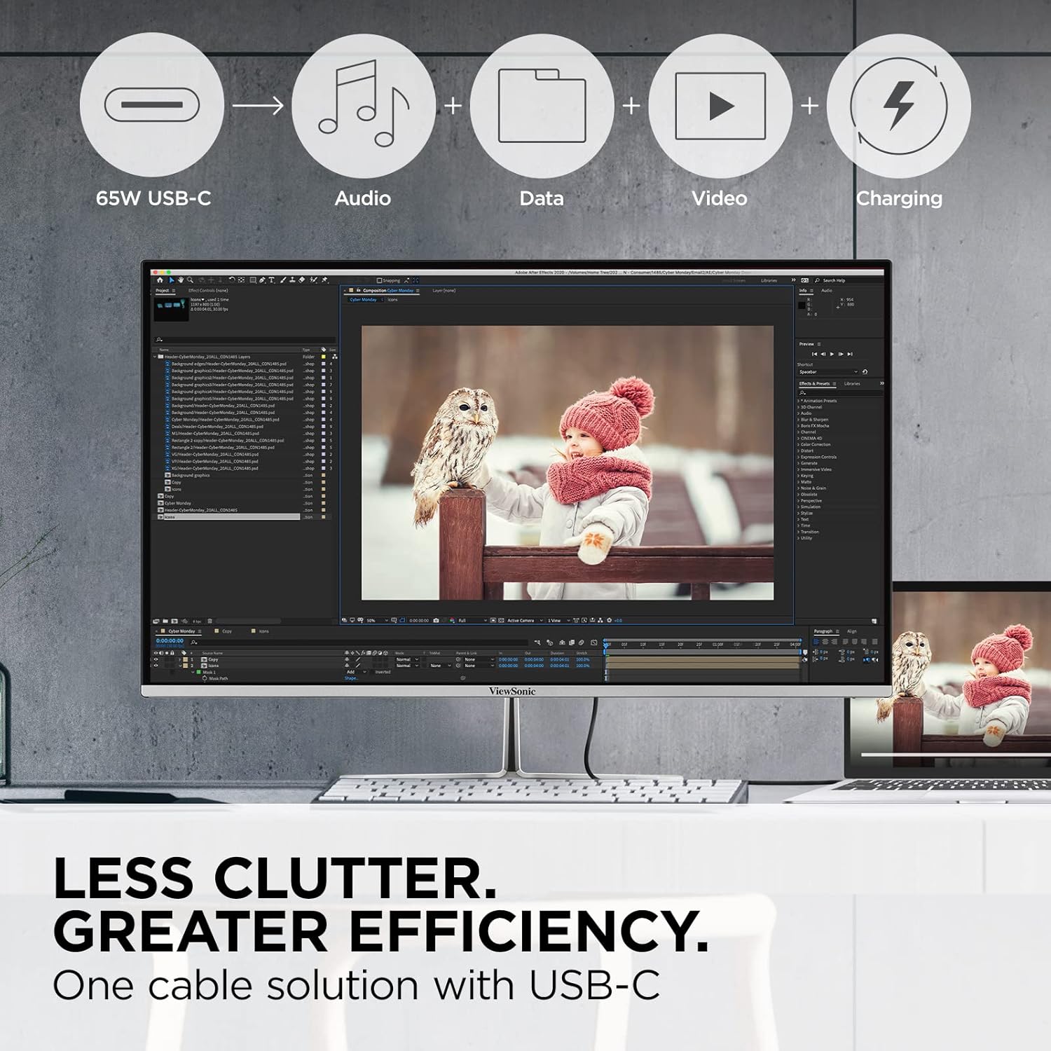 - LESS CABLE CLUTTER: 60W USB-C connectivity for fast data, audio and video transfer, and 65W charging over one cable