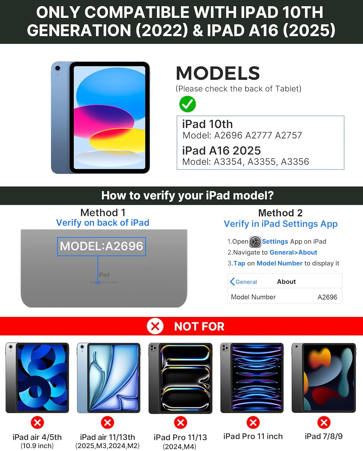 - Compatibility: Designed for iPad 10th Generation 10.9 inch 2022 Models A2696 A2757 A2777 and iPad 11th 2025 A16 Chip.Please check the model number on the back of your iPad to ensure a perfect fit