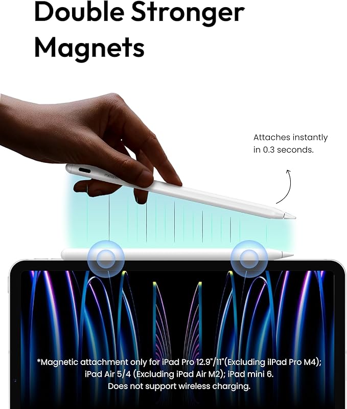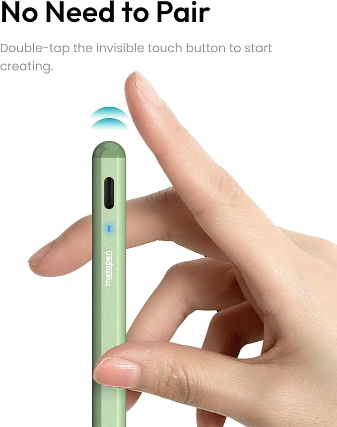 - 【Quick Connect and Double Magnets】: No need to connect via Bluetooth or apps. Simply double-tap the invisible touch switch on the rounded end of A8 to power ON/OFF. With two built-in magnets, the Metapen iPad Pen securely attaches to your iPad anytime, no more rolling away or getting lost. (NOTE: Wireless Charging is NOT Supported. NO magnetic attachment for iPad Air 3rd/M2/M3 Gen, iPad 6th/7th/8th/9th/10th/11th Gen, iPad mini 5th/7th, iPad Pro M4)
