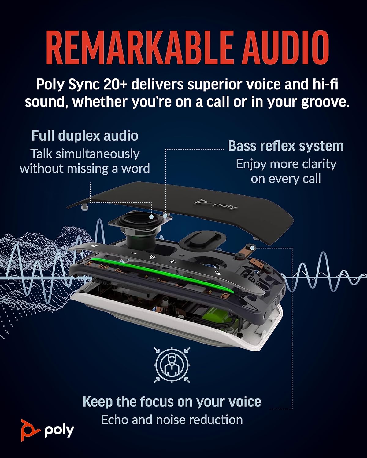 - WORK ON THE GO: Keep your smartphone charged and ready using your Poly Sync 20+ personal Bluetooth speakerphone, featuring up to 20 hours of battery life. It’s lightweight, IP64 dust-and water-resistant, and comes with its own carrying case.