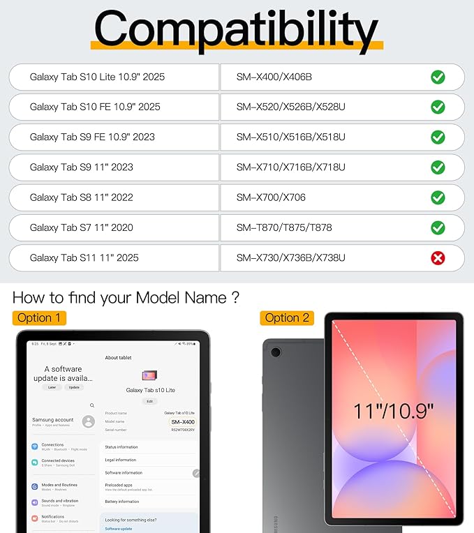 - Compatibility: This rugged case is compatible with the following 6 models: Samsung Galaxy Tab S10 Lite 5G 10.9 inch 2025 Model: SM-X400/X406B, Samsung Tab S10 FE 10.9 inch 2025 Model: SM-X520/X526B/X528U, Samsung Galaxy Tab S9 FE 10.9 inch 2023 Model: SM-X510/X516B/X518U, Samsung Galaxy Tab S9 11 inch 2023 Model: SM-X710/X716B/X718U, Samsung Galaxy Tab S8 11 inch 2022 Model: SM-X700/X706, Samsung Galaxy Tab S7 11 inch 2020 Release Model: SM-T870/T875/T878U. Not fit any other tablet. Before purchasing, please confirm the model of your Samsung tablet