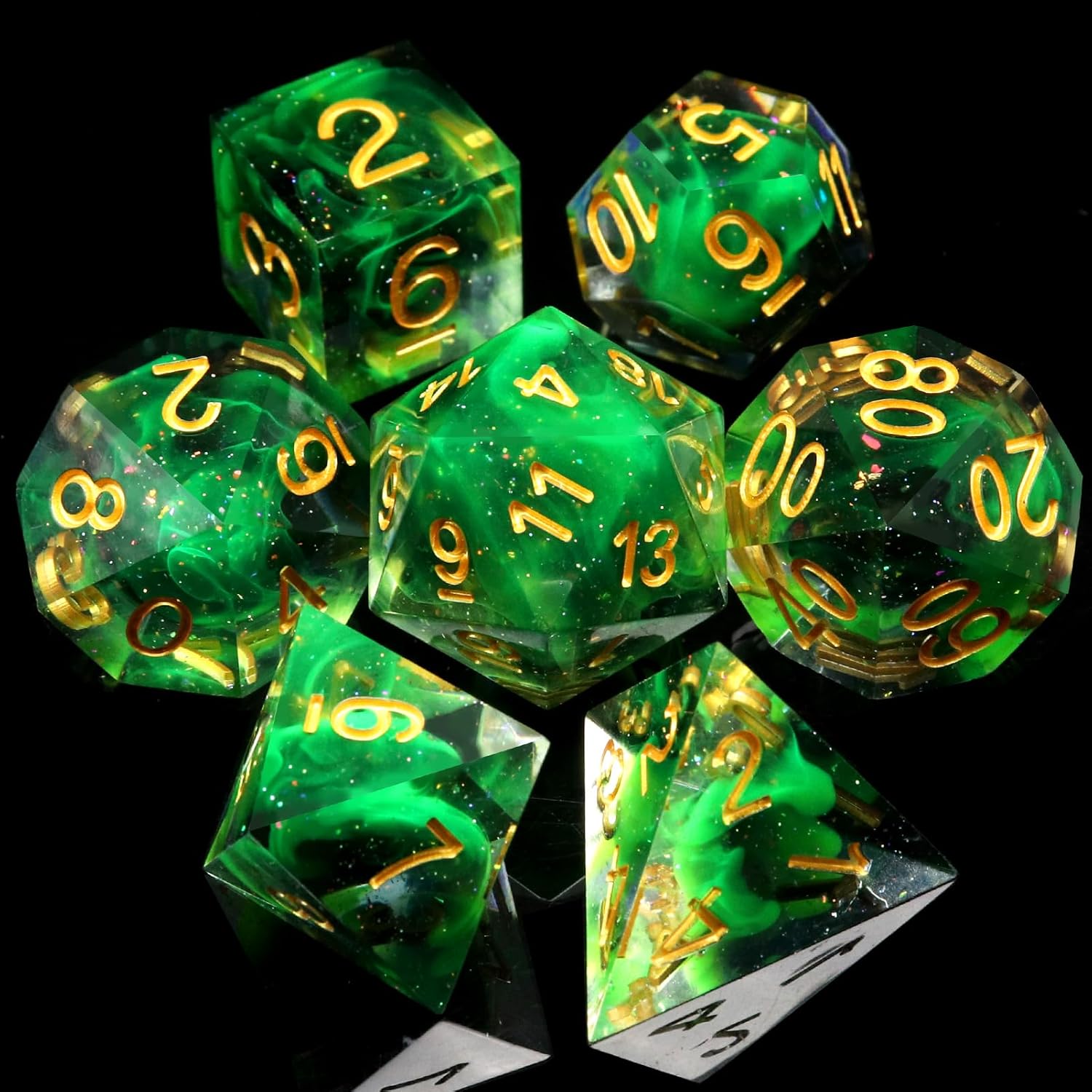 - Glitter Sharp Edge Dice With Dice Box: Pretty green sharp edge dnd dice set with iridescent glitters inside. Neat and clean mirror-level surface 7PCS rpg dice set containing one of each of d4, d6, d8, d10, d%, d12 and d20.