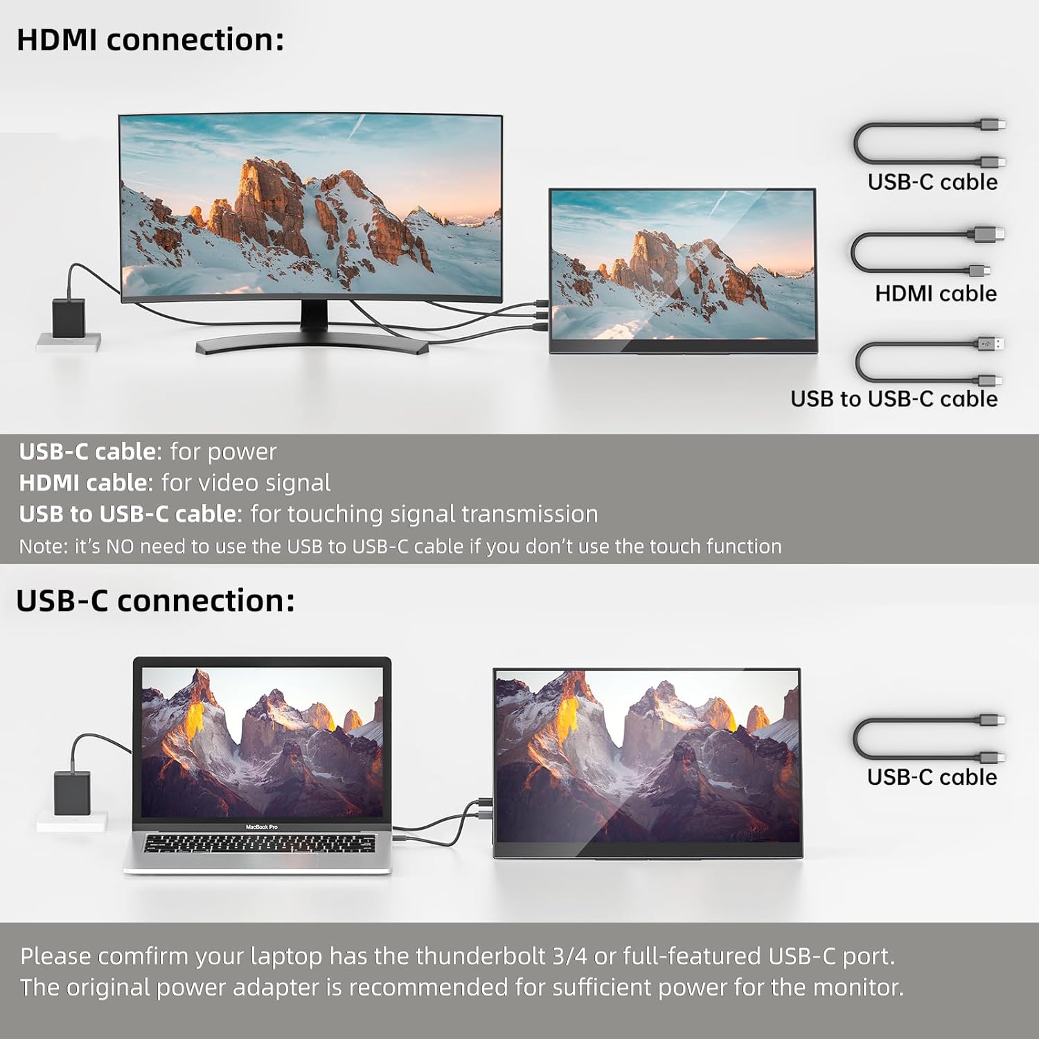 - To use the Touchscreen: 1)When using HDMI cable for display, please use the USB-A to USB-C cable to connect your Windows laptop/computer PC to the monitor for touching signal. 2)“10-point” Touchscreen is only supported on Windows, and is NOT supported on MacOS. 3)iPad, iPhone, game consoles (PS4, PS5, Xbox, ...) do NOT support touchscreen