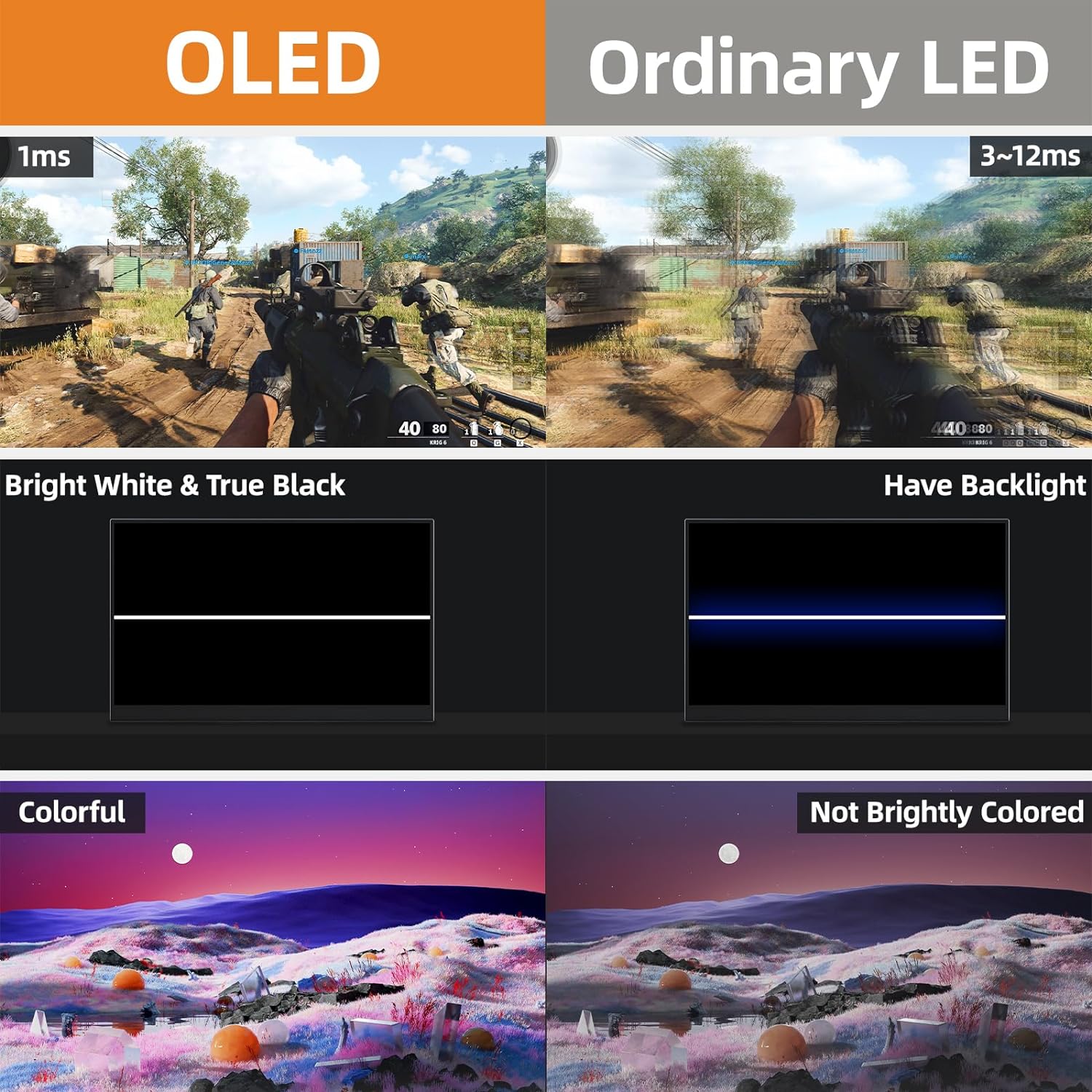 - Portable, Ultra Slim & Light Weight: Measuring only 0.17 inch at the slimmest point and 1.9 lbs weight, beautiful design, it's a good choice for business trip and travelling. This portable OLED monitor supports portrait and landscape mode to meet your different needs. We also provide a sleeve case in the box. With the patented kickstand, this portable monitor for laptop is ease to set up and stable, also saves your space on the desk