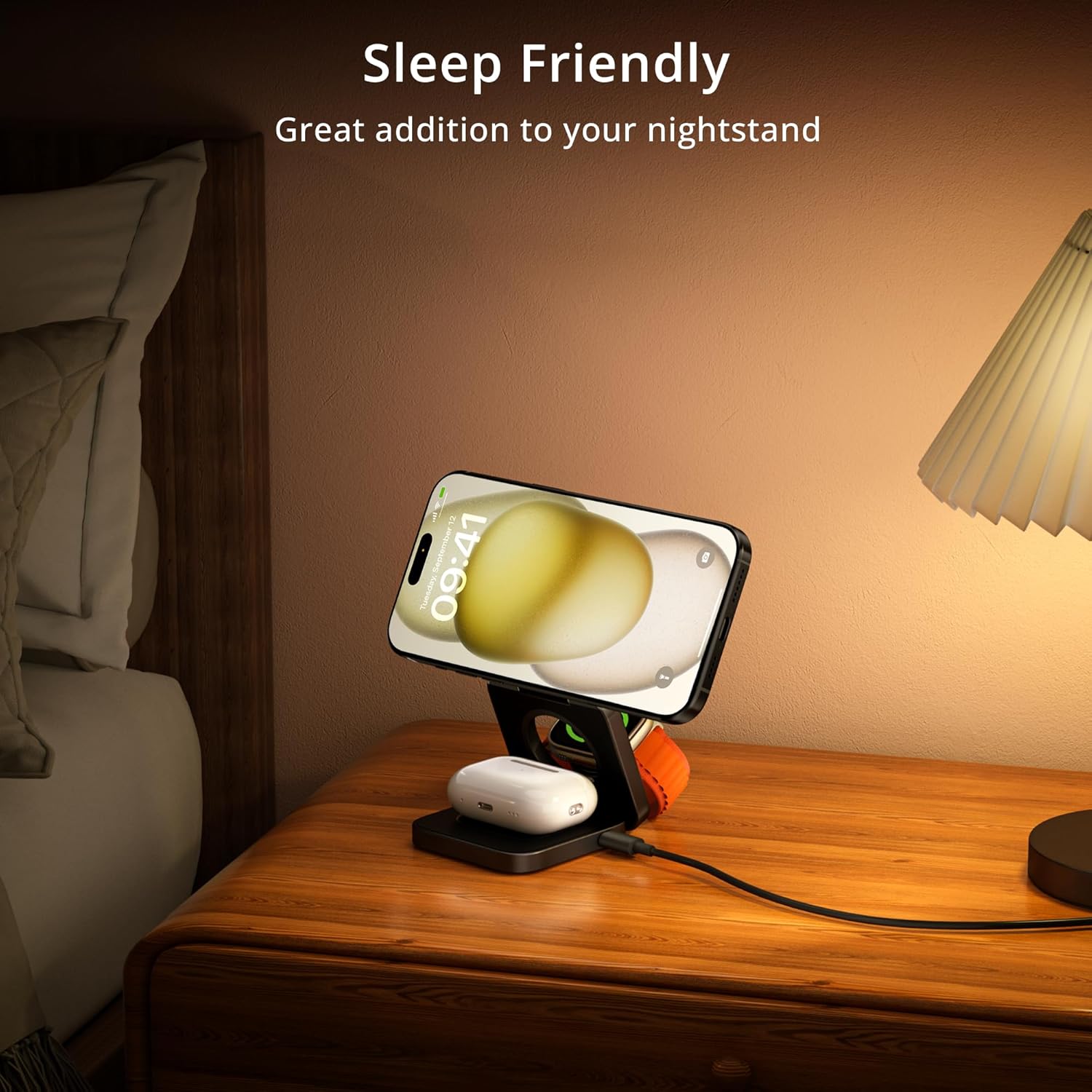 - 15W Fast Magnetic Charging Station: Experience the power of advanced wireless charging technology with our 15W fast magnetic charging station. Enjoy a quick and reliable charging experience for your Apple devices—no more worrying about slow charging speeds! Our 3-in-1 charging station allows you to charge your iPhone, AirPods, and Apple Watch simultaneously—all in one convenient location. Say goodbye to cluttered cables and messy desks, and hello to a tidy and organized charging solution;