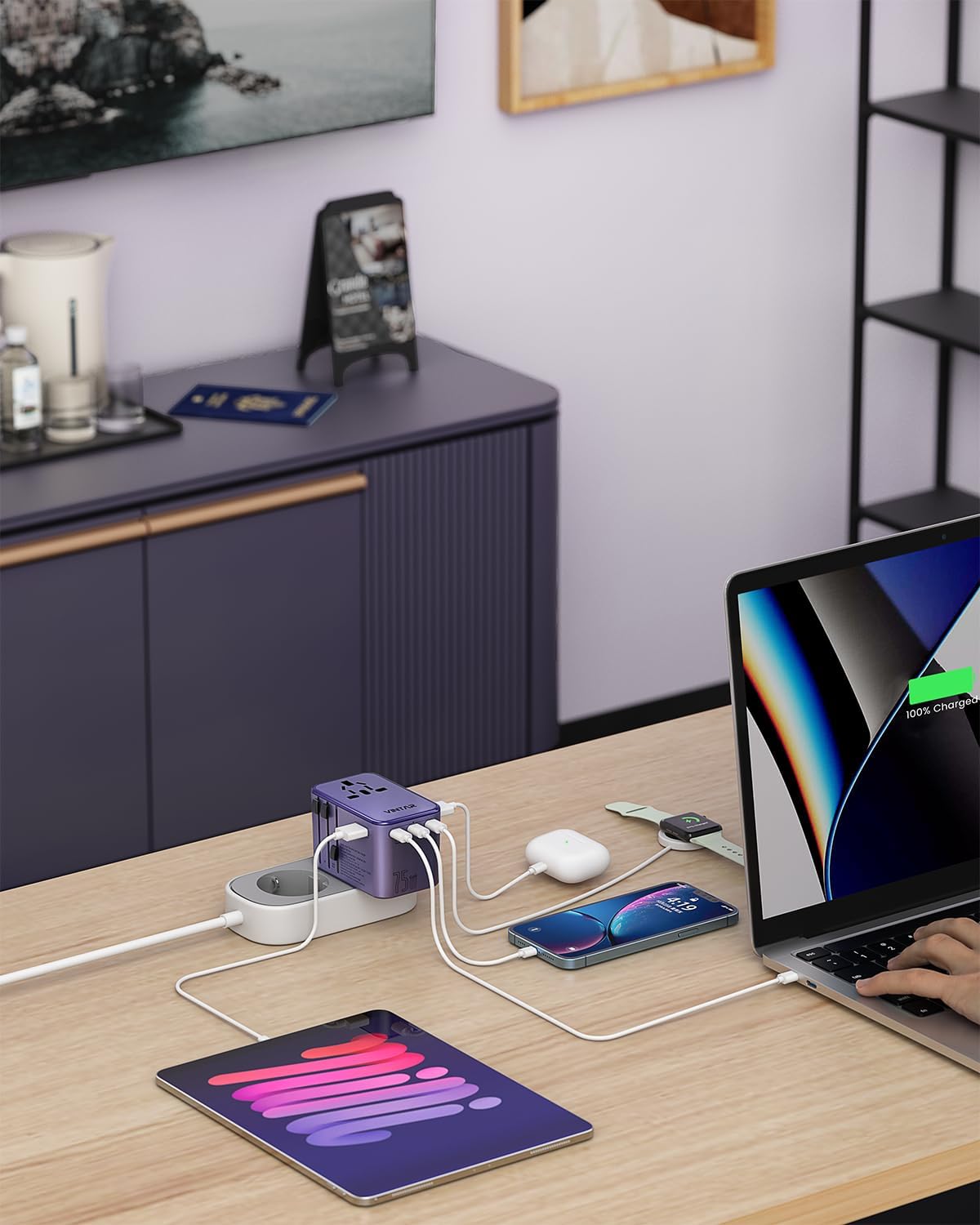 Universal Travel Adapter, VINTAR 75W GaN International Power Adapter with 3 USB C PD and 2 USB A QC, All in One Travel Essentials for UK/EU/USA/AUS, Travel Adapter Worldwide for Laptops Phones, Purple