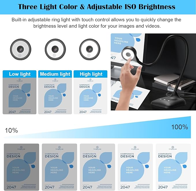- Document camera for teachers with 3-level LED light and 5-level exposure: touch LED light button, simple and convenient operation, 3-level brightness adjustable, can change the brightness according to the environment. You can also use the "☼" button to perform 5 levels of fill light, making it easy to see objects clearly in dim environments