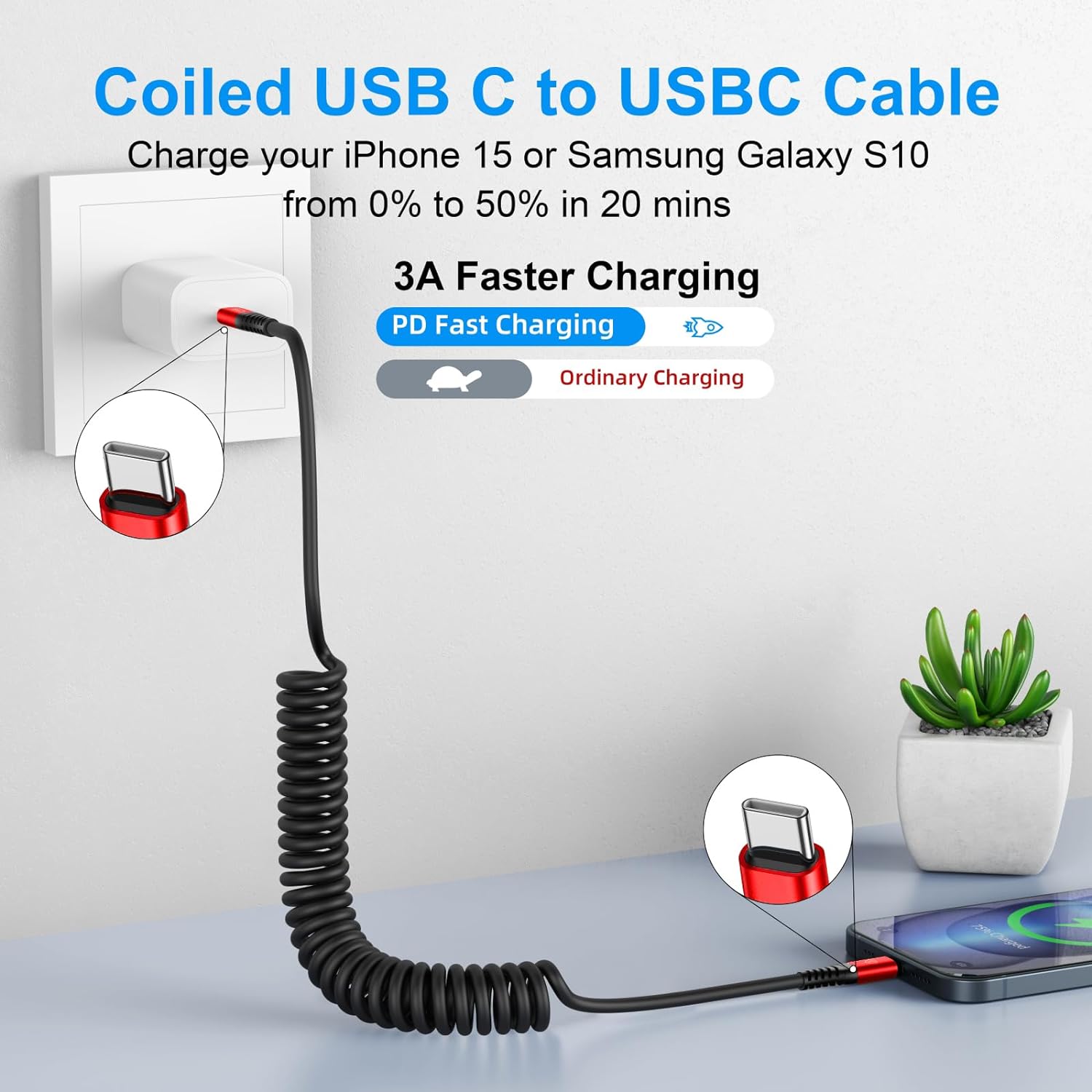 - USB C to USB C Cable Fast Charging for Car: Coiled type c car charger with spring shape design, portable and not tangled. It can well save the use of space in the car and say goodbye to the hassle of data cable clutter and tangles.