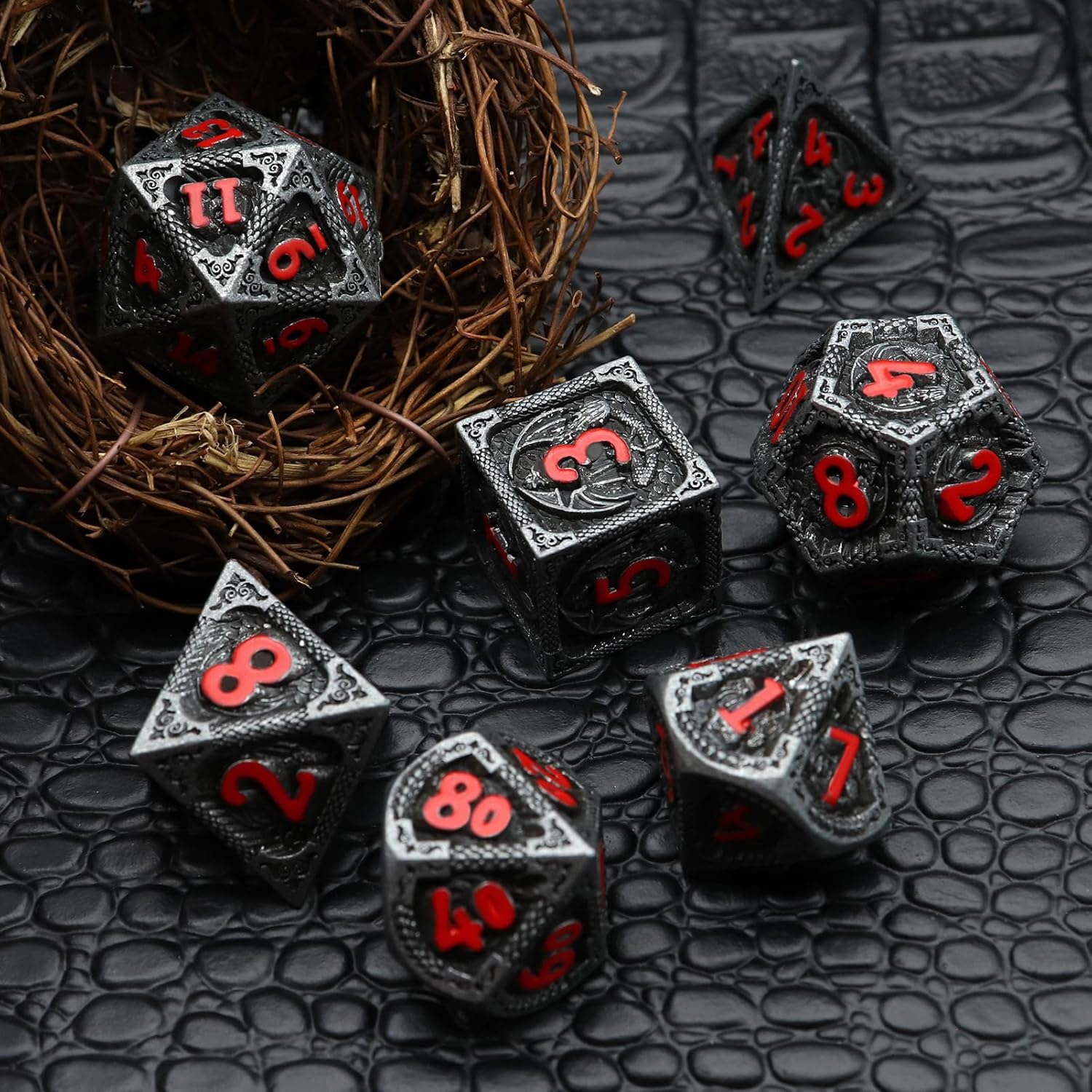- Unique Dragon Metal Dice Set Black: Cool dragon dnd dice with fire-breathing scenes? Here they come! The matt black metal dice set is engraved with three layers, dragon scale, dragon fire balls, wings, claws, tails and even its throne! A must-have for d&d and sure envy on the table