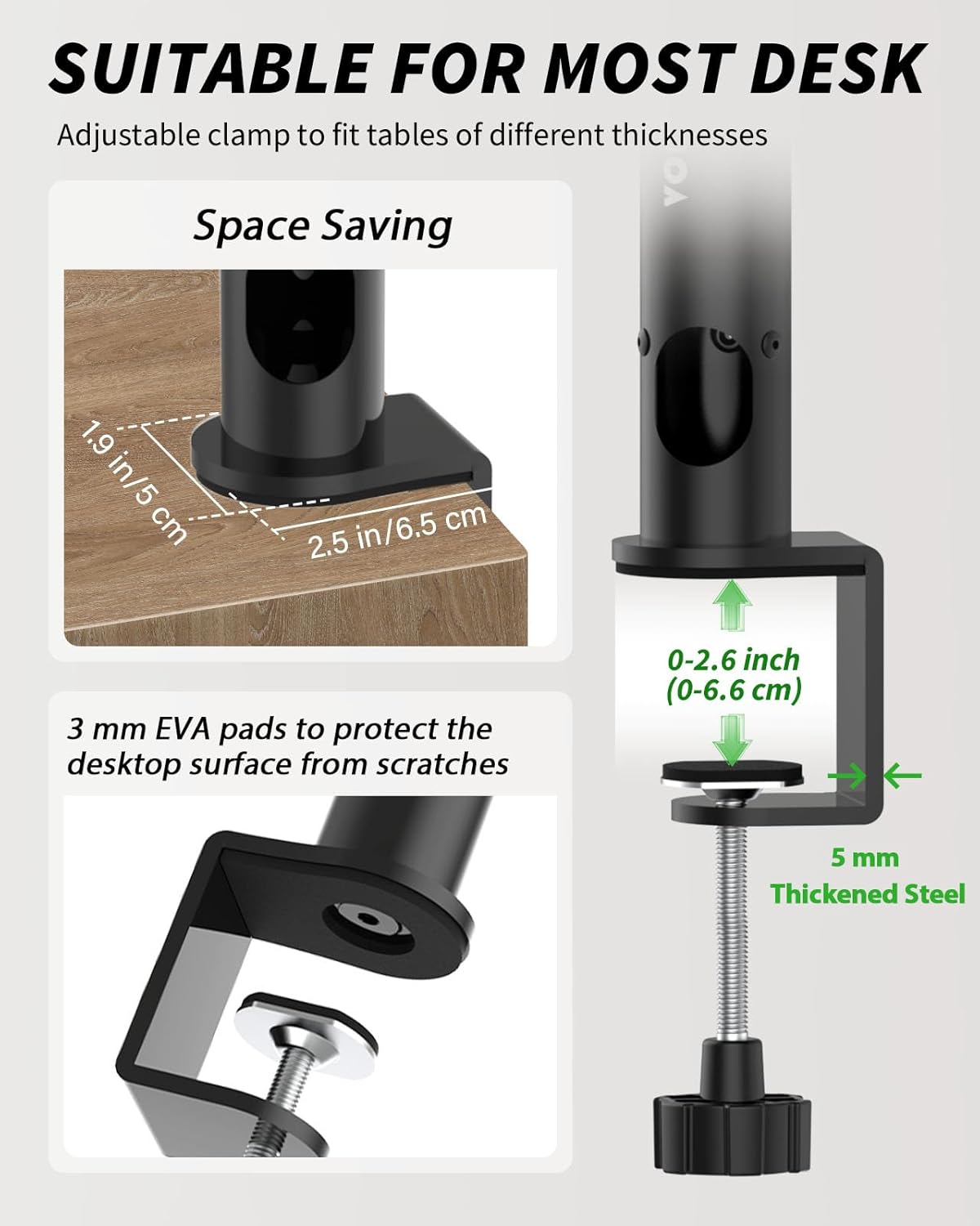- 【Upgrade Desk Clamp】 5 mm thickened clamp, grade 8.8 reinforced steel screws, 3 mm EVA pad on the clamp. Only takes up 32.5 cm² of surface to clamp on your desktop, saving even more desk space. Clamp adjustable range is 0"-2.6", fits most desktops with different thickness.