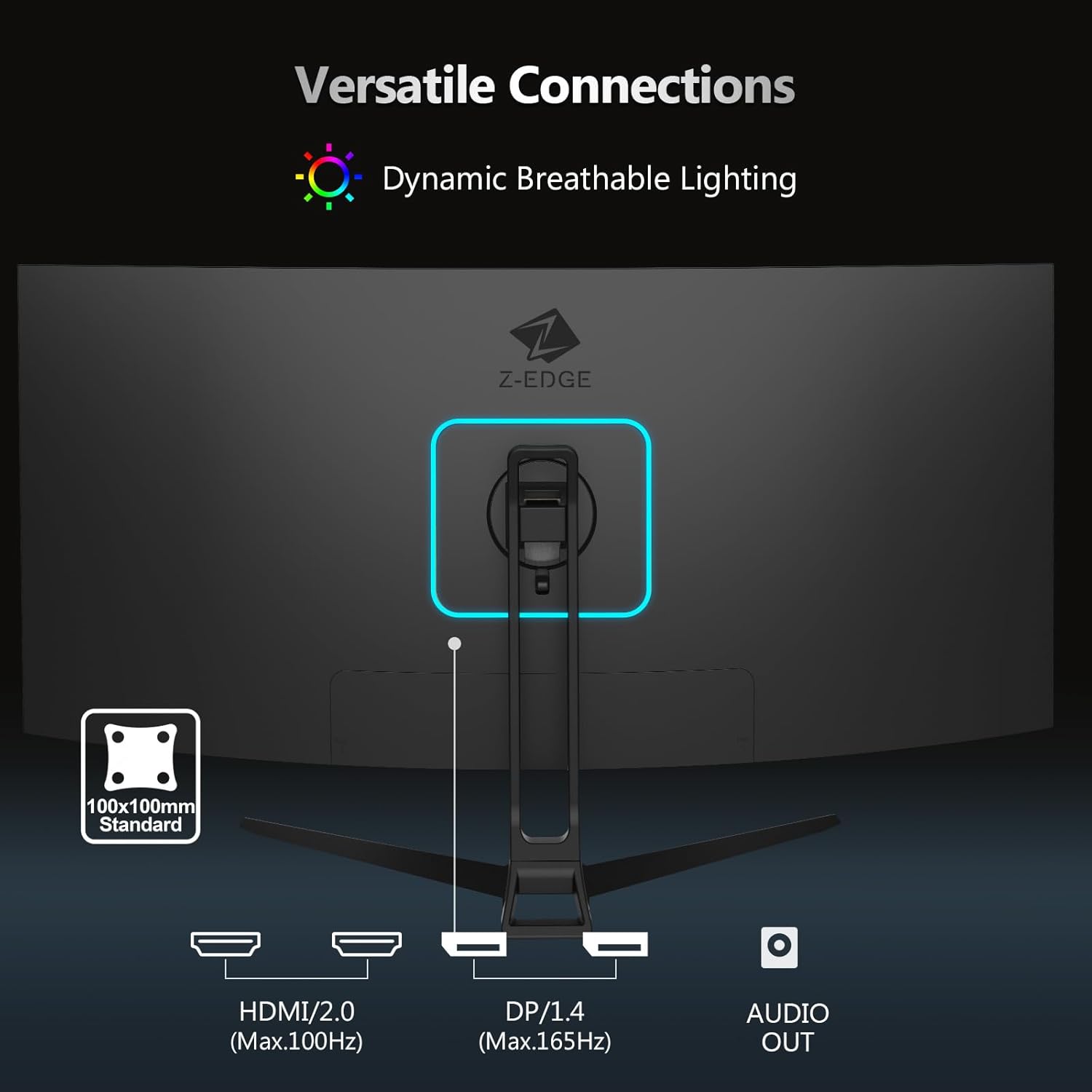 Z-Edge 34" Curved Gaming Monitor, WQHD 1440P 165Hz 144Hz PC Monitor, MPRT 1ms, 21:9 Aspect Ratio, 1500R, 16.7M Colors, 3000:1 Contrast, UG34 Frameless Bezel, 2X DP 1.4 Ports and 2X HDMI 2.0 Port