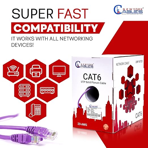 NewYork Cables CAT6 Plenum Cable 1000ft | 100% Solid Bare Copper, UTP, 550MHz, 23AWG, 4Pair 10GB Ethernet Cable, Certified CMP-Rated Bulk Cat 6 for Networking & Gaming (1000ft, Pure Copper,Purple)