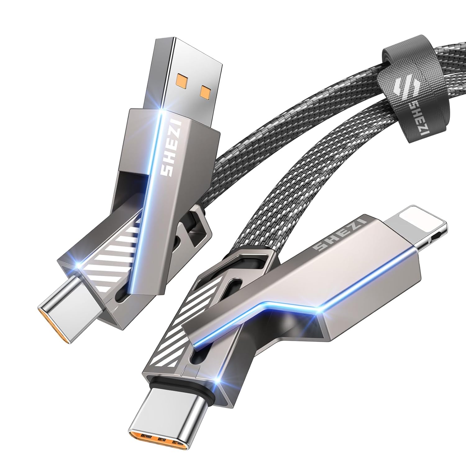- 4-in-1 USB C Charging Cable: This cable combines Light-ning, Type C and USB A three kinds of ports. 1 cable is equivalent to 4 cables, allowing you to easily achieve USB A to Lightning, USB A to Type C, Type C to Lightning, Type C to Type C port conversion, compatible with iPhone, Samsung,tablet, MacBook, Android phone and other devices. Welcome to the minimalist life and say bye to complicated piles of data cables