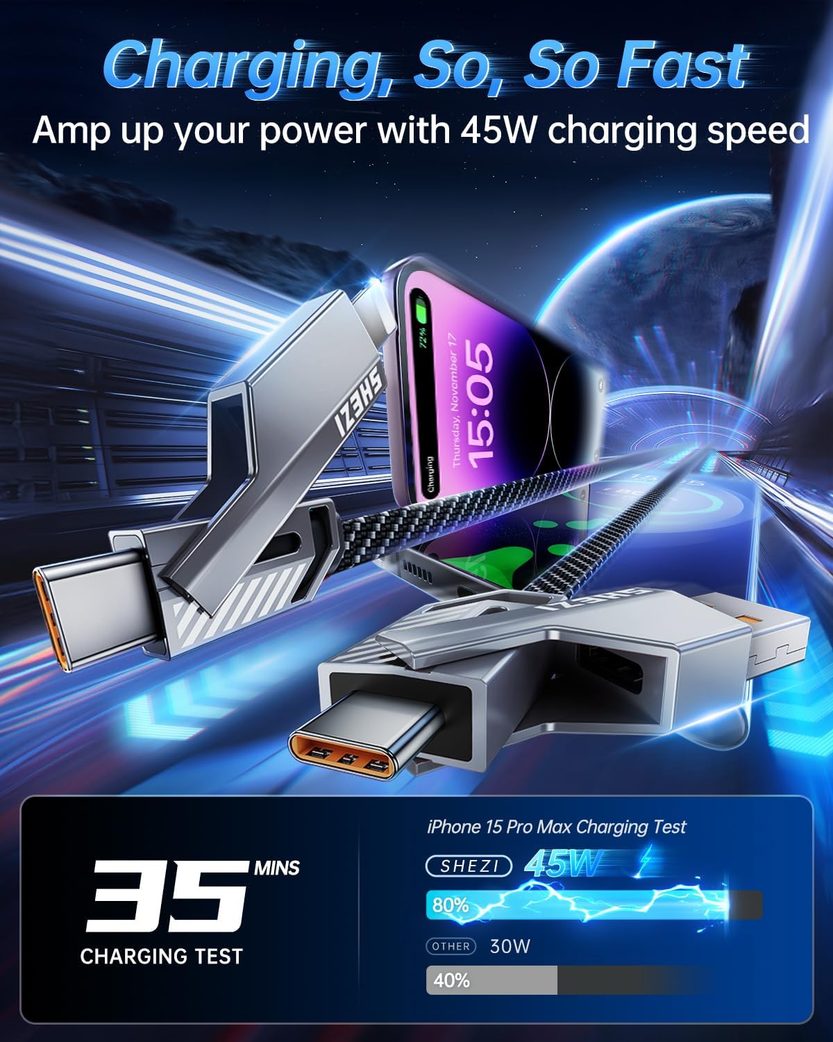- 45W High-Speed Charging: Our multi-charging cable is equipped with 45W charging power, allowing you to get the power required for one day in 35 minutes. Note: To achieve 45w fast charging, please be equipped with a charging adapter of more than 45W