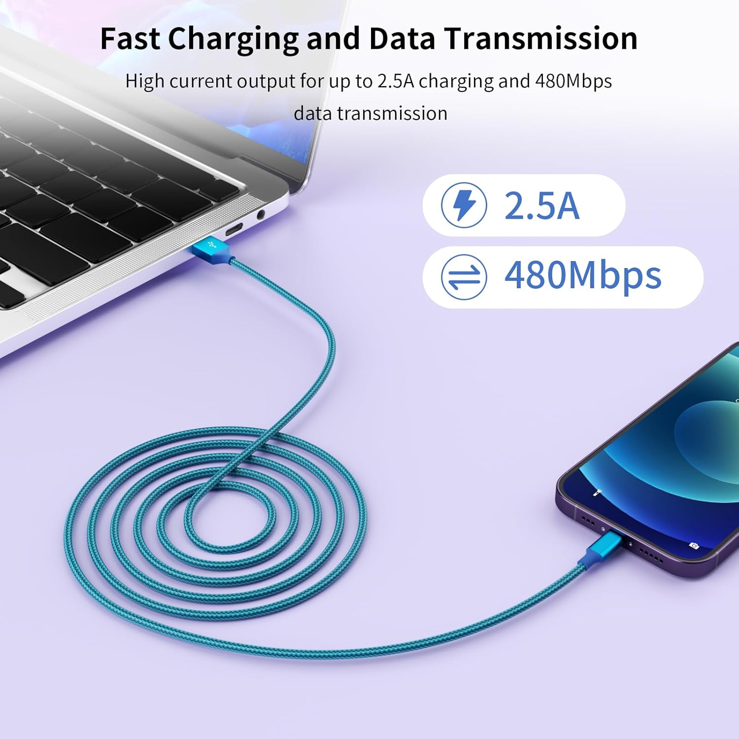 - 【Fast Charging & Secure Transmission】:2.5 A output fast charging is 2 times of normal usb a to lightning cable, maximized the charging efficiency. Insist on using premium, thickened copper wiring inside usb iphone charger cable to guarantee 480 Mbps/s fast data transmission. ( To charge your iPhone faster, you can connect this usb lightning cable to 20W USB power adapter for charging)
