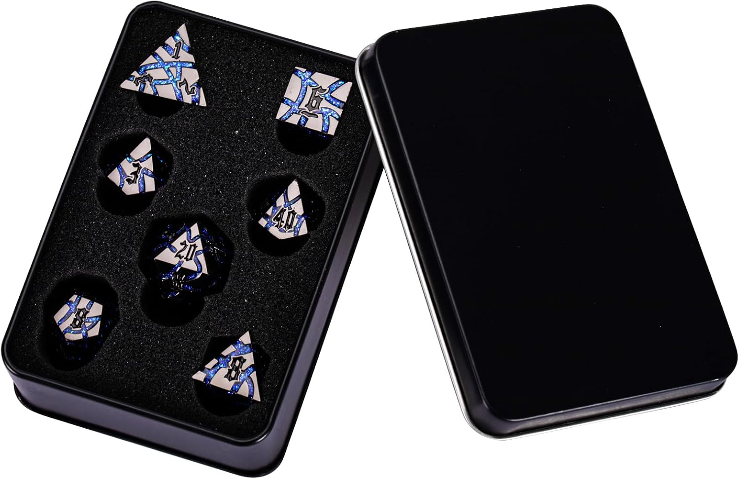 DND Crack Stripe Dice,Metallic Glitter Dice Set with Gift Box,Metal Polyhedral D&D Dice for Role Playing Game(Black Nickel Blue)