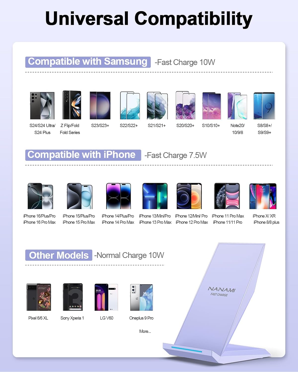 - [Two Wireless Charging Modes] - 10W Fast Charge Model: for Galaxy S25/S25+/S25 Ultra/S24/S23/S22/S21/S20/S20+/S20 Ultra and Note 20/20 Ultra, required QC 2.0 or above adapter as its power source(Not Included); 7.5W Fast Charge Model:for iPhone 16/16 plus/16 Pro/16 Pro Max/15/15 plus/15 Pro/15 Pro Max/14/14 plus/14 Pro/14 Pro Max/iPhone 13/13 mini/13 Pro/13 Pro Max/12/12 Pro/12 Pro Max/11/11 Pro/11 Pro Max/XS/XS Max/XR/X/8/8 Plus; 5W Standard Charge Model: Standard QI enabled devices like Pixel 3/3XL,Samsung S6/S6Edge; Some device may require the additional Qi wireless receiver.