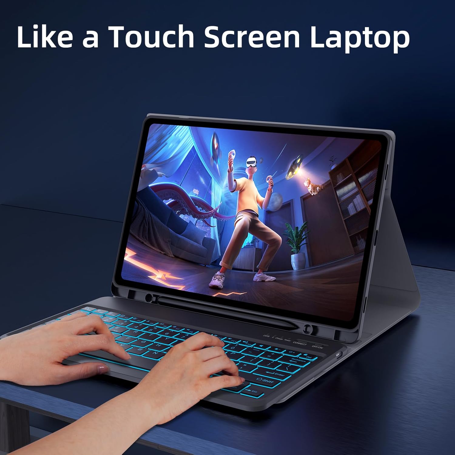 - ăDetachable Magnetic Keyboardăâ Easily snap the wireless backlit keyboard on/off your Samsung tablet case. Adjustable angles adapt to your typing or viewing needs.