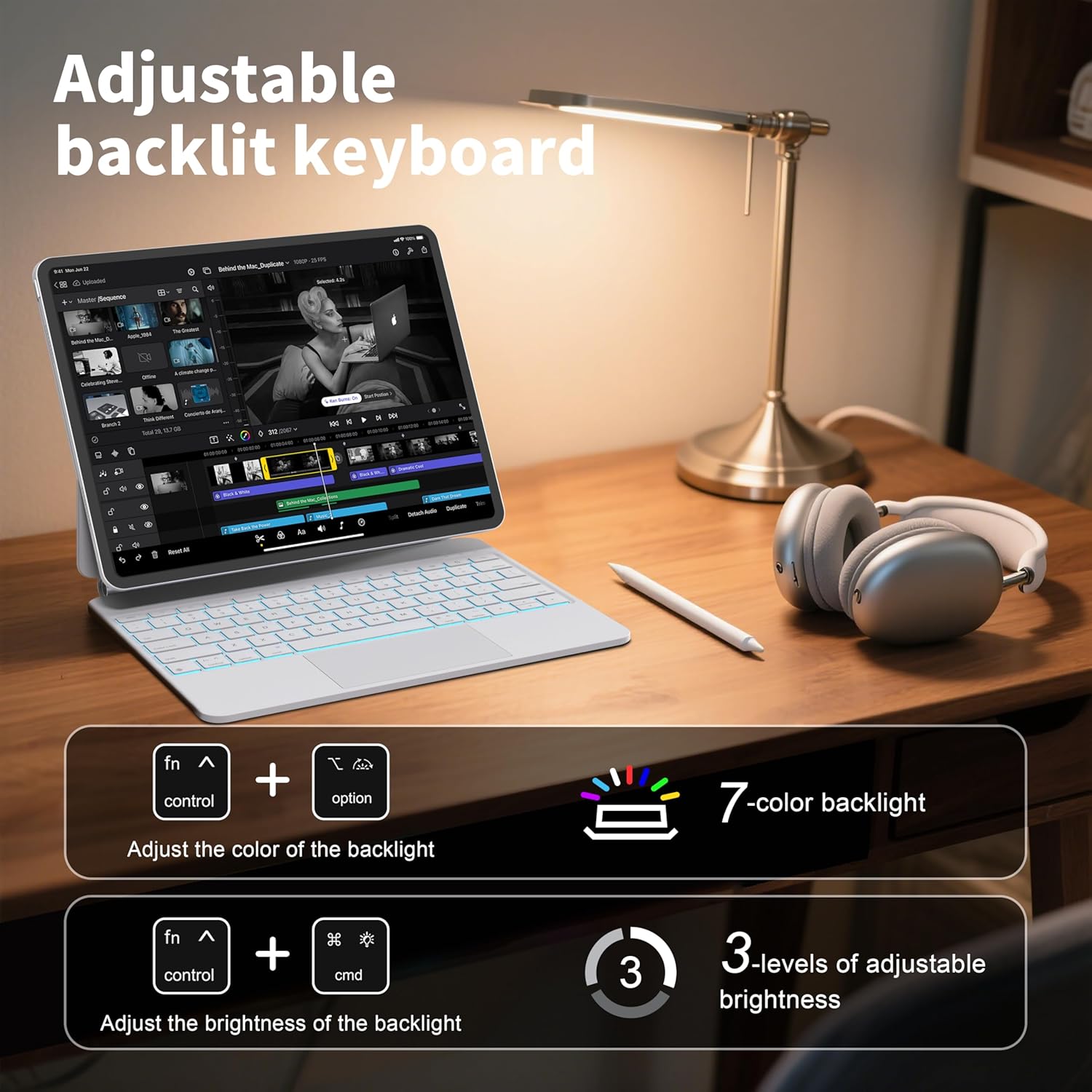 iPad Pro 13 inch case 2024 with Keyboard, Keyboard Case for iPad Pro 13-inch (M4, 2024) with 7 Colors Backlight, Multi-Touch Trackpad, Easy-Set Magnetic Stand, Auto Sleep/Wake (White)