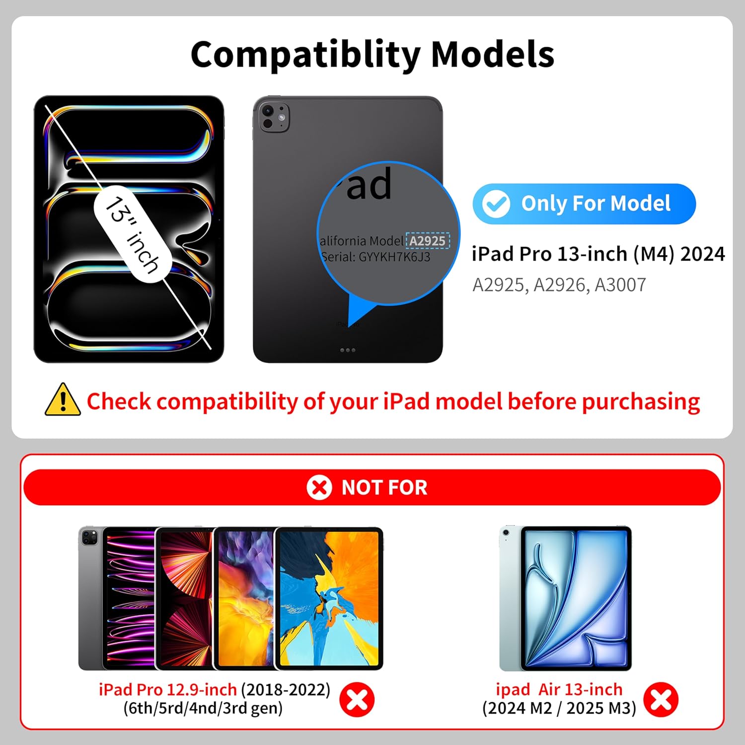 - ăOnly CompatibleăThis multi-functional magic keyboard case is only compatible with iPad Pro 13-inch (M4) 2024 (Model: A2925, A2926, A3007). Note: Not for iPad Air 13-inch (M3 / M2) and iPad Pro (12.9-inch) (6th,5th,4th,3rd generation)