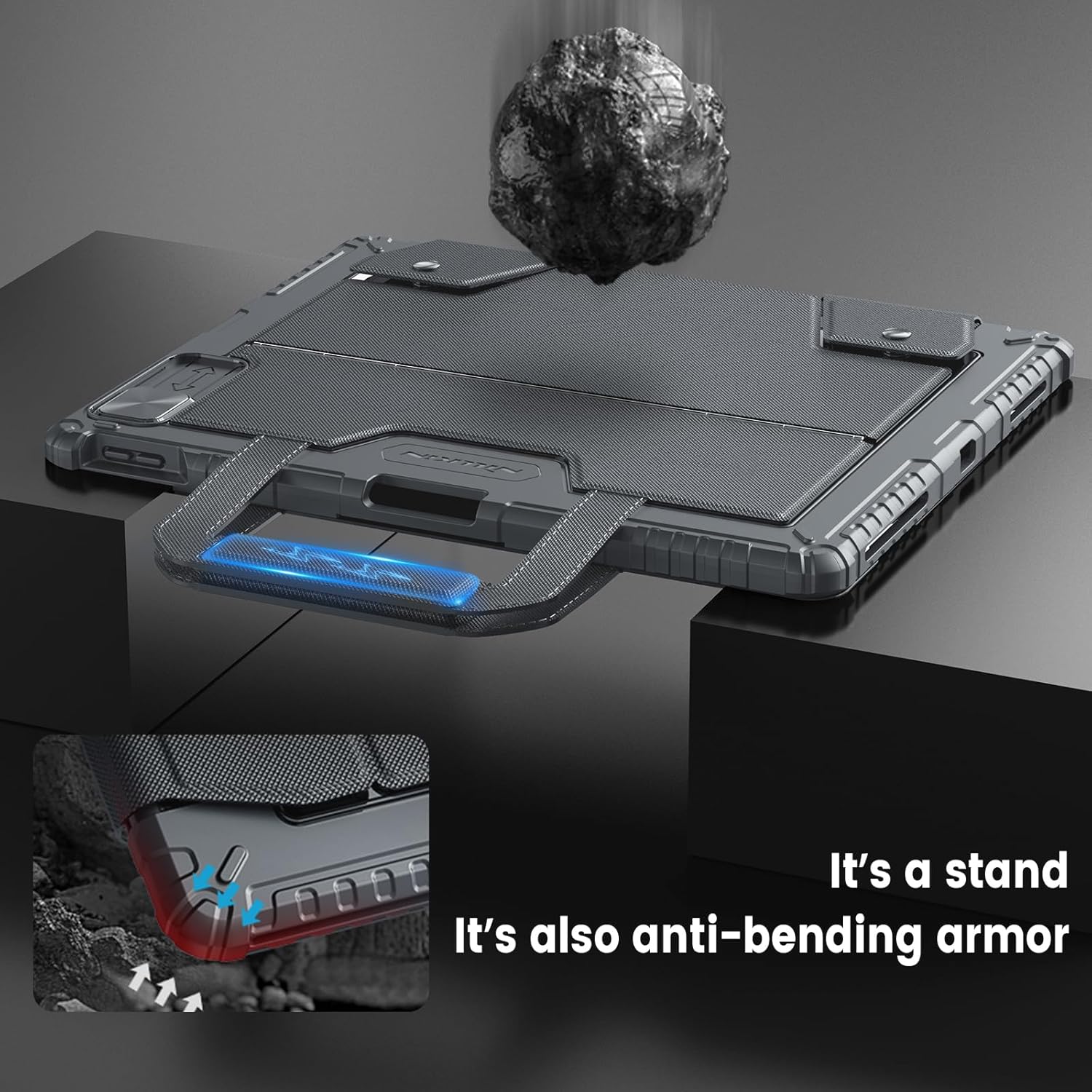 - ăSturdy iPad keyboard case with Camera Protection CoverăSturdy Rugged case with bumper,provides ample protection for the device.The pen holder allows the Apple Pencil to securely charge when not in use. Notice: Product Weight is 634g/1.39lb.The military grade protection will add a bit of weight in this case.