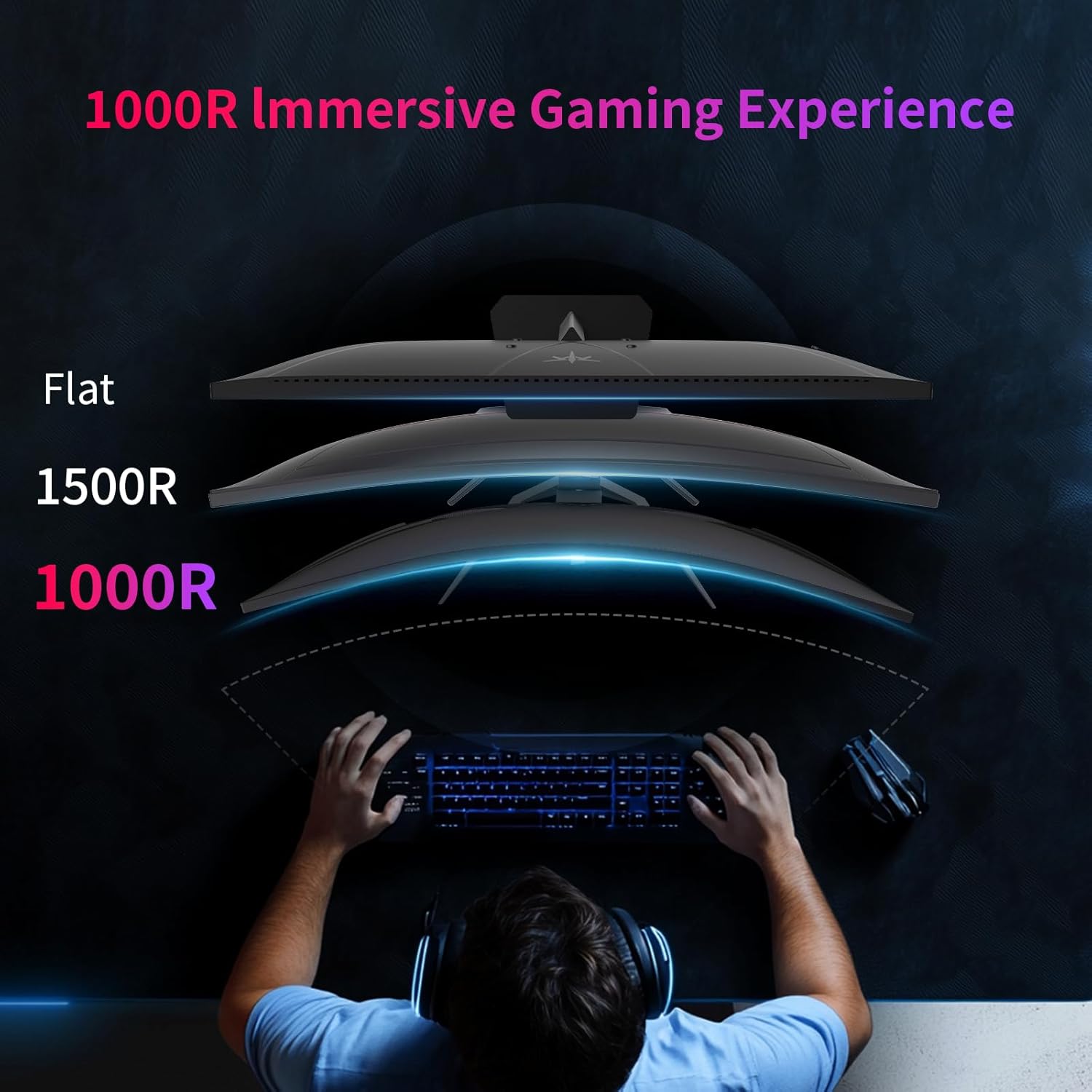 - [More Immersive 1000R Curved Screen] The 1000R Curved Gaming Monitor is a cutting-edge display designed to enhance your gaming experience by featuring a curvature radius of 1000 millimeters. Tighter than 1500R, the curvature closely mimics the natural shape of your eyes, helping to reduce distortion and providing a wider field of view.