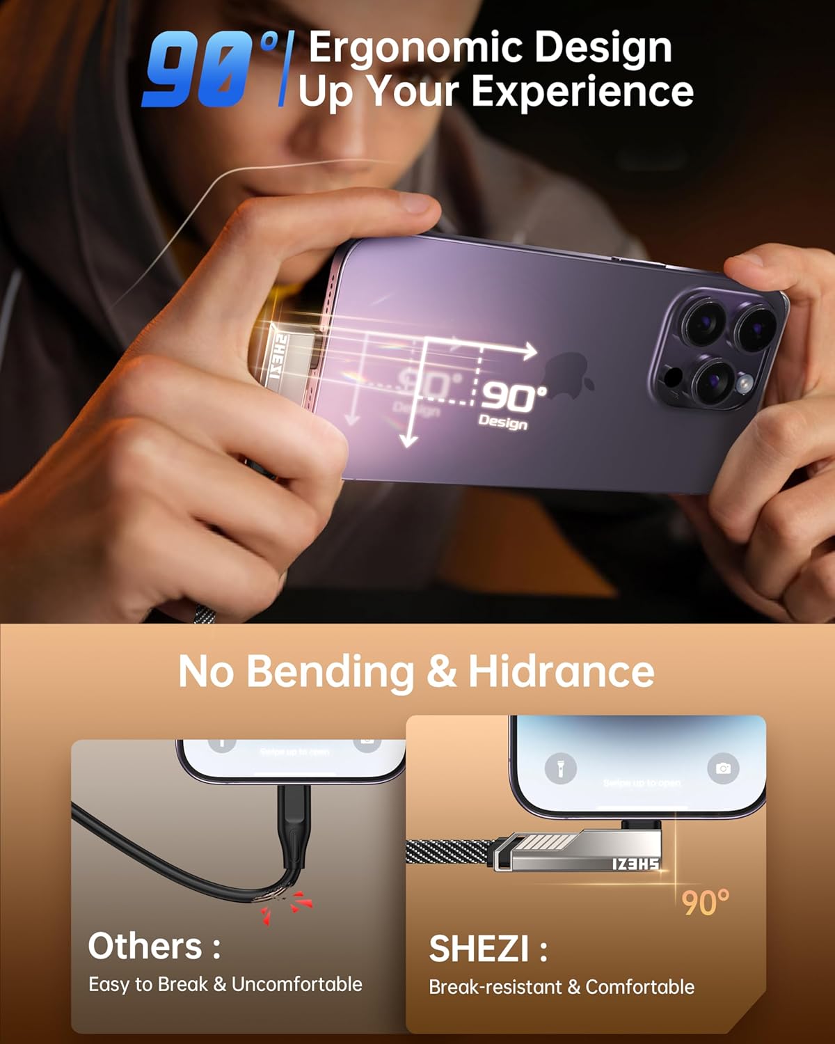 - Innovative 90-Degree Design: Enjoy comfortable device use while charging with our right-angle iphone cable, perfect for gaming, videos, or working on the go. Say goodbye to awkward bends! It is the ultimate accessory for a seamless experience
