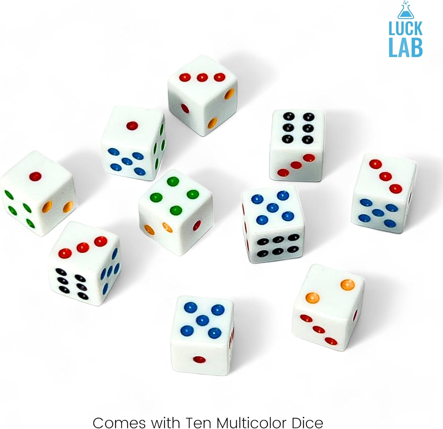 Luck Lab 10 Piece D6 Multicolor Pip Dice Pack - Acrylic 16mm Square Edge Standard Dice for RPG MTG DND Table Games and Board Games, Storage Bag Included (White Multicolor)