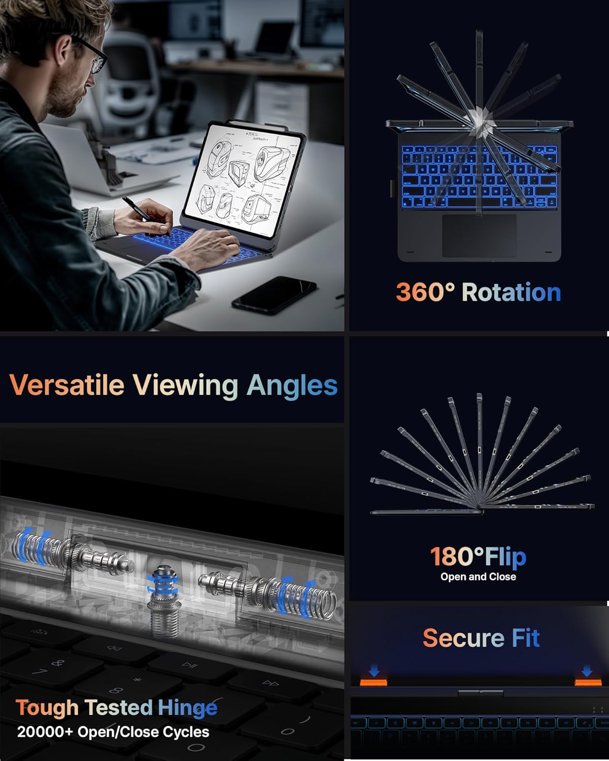 - Usage Modes: 360° hinge on this iPad Pro 13 inch keyboard offers 7 different usage modes for writing, drawing, watching videos, or browsing; Ideal for classrooms, critical tasks, or creative activities.