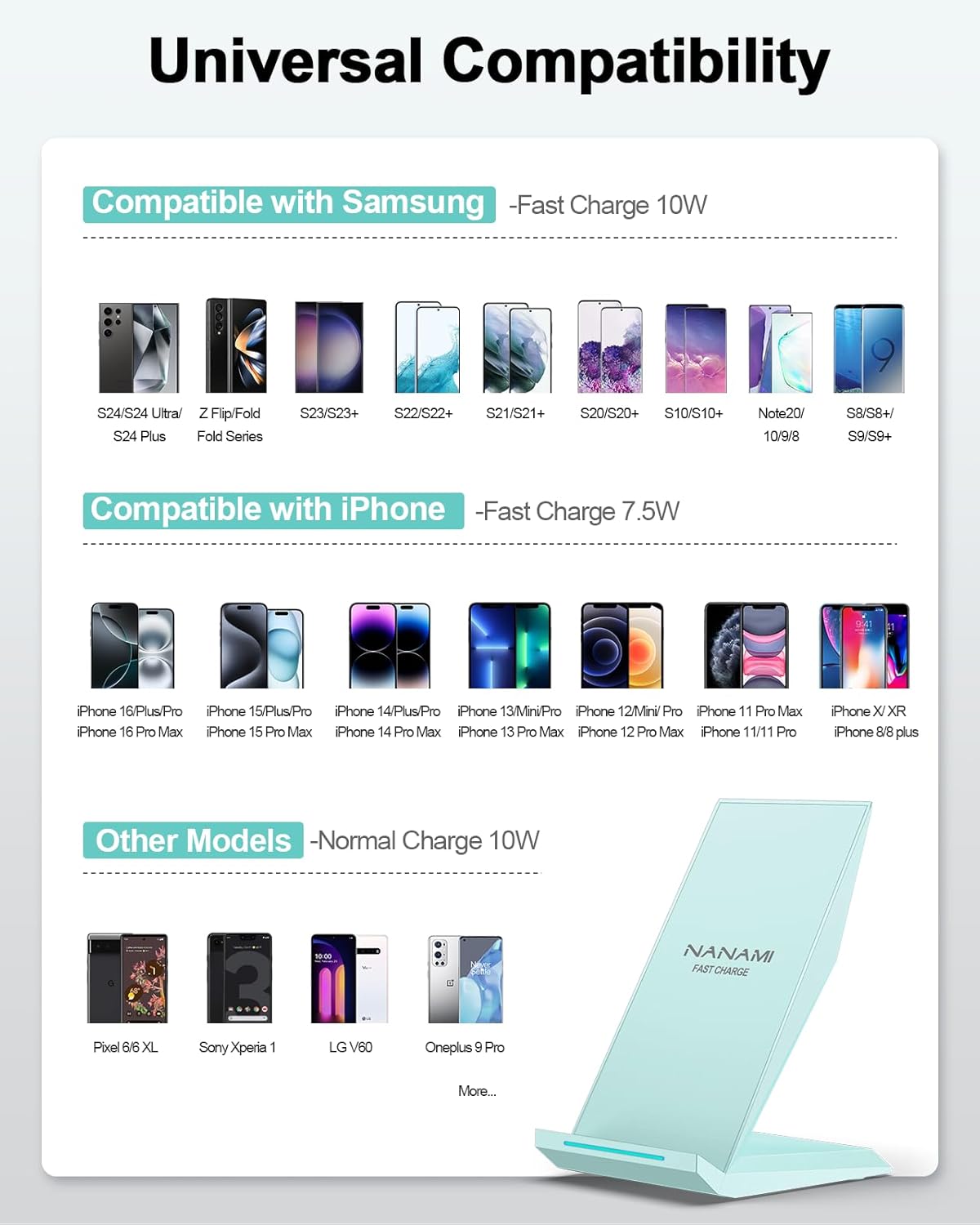 - [Universal Compatibility] The NANAMI wireless charger offers 2 charging modes. 10W fast charge mode is compatible with Samsung Galaxy S25/S25+/S25 Ultra/S24/S24 Ultra/S23/S23 Ultra/S22/S22 Ultra/S21/S21+/S21 Ultra/S20/S20+/S20 Ultra/S10/S10 Plus/S10E/S9/S9 Plus/S8/S8 Plus/S7/S7 Edge/S6 Edge Plus and Note 20/20 Ultra/10/10 Plus/9/8/5. 7.5W standard charge mode is compatible with iPhone 16/16 Plus/16 Pro/16 Pro Max/15/15 Plus/15 Pro/15 Pro Max/14/14 Plus/14 Pro/14 Pro Max/SE 2022/13/13 mini/13 Pro/13 Pro Max/12/12 Pro/12 Pro Max/SE 2020/11/11 Pro/11 Pro Max/XS/XR/X/XS Max/8/8 Plus.