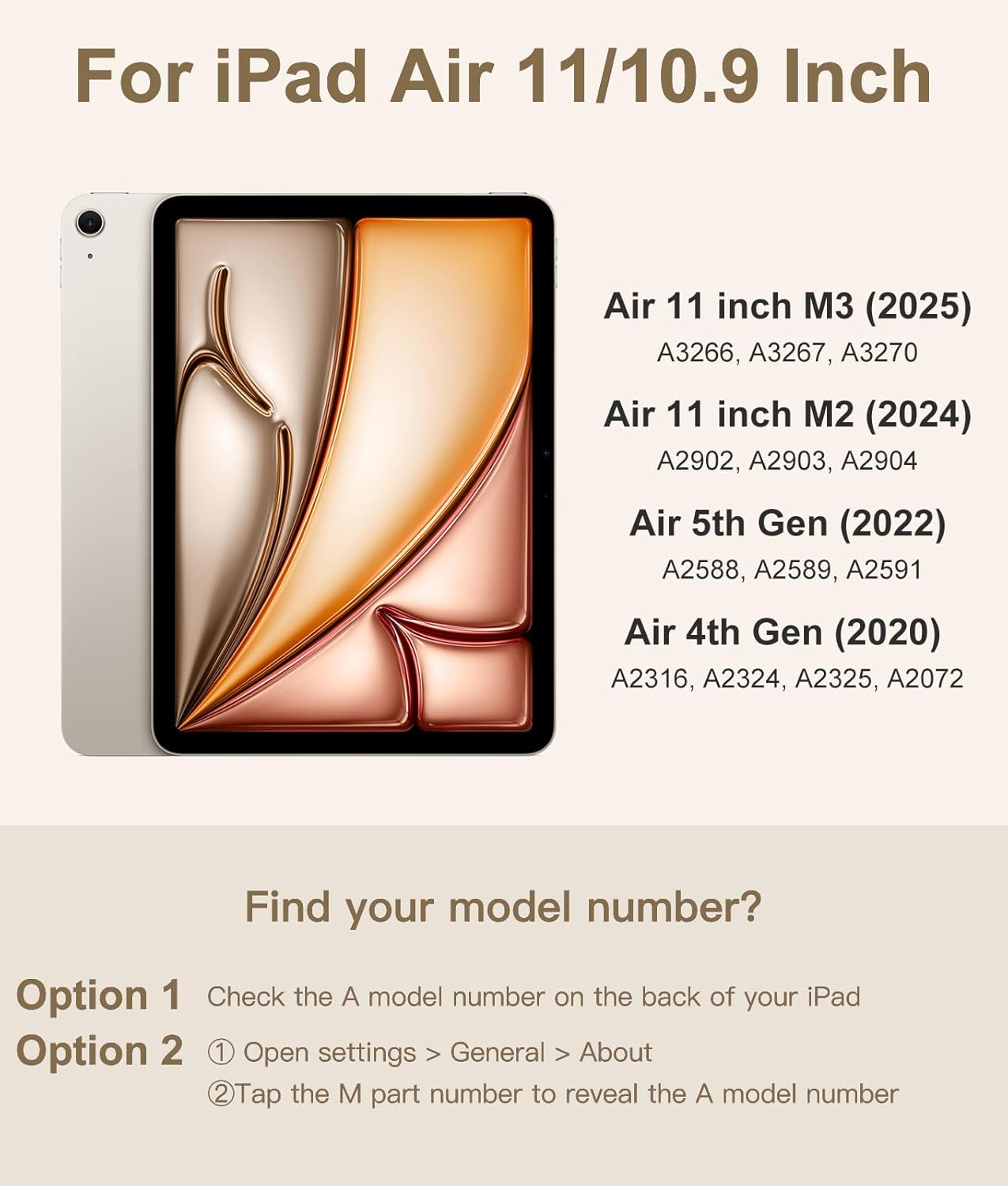 - â€ăPerfect CompatibilityăSpecially designed Compatible with iPad Air 11-inch (M3) 2025 (Model Number: A3266/A3267/A3270), for iPad Air 11-inch (M2) 2024 (A2902/AA2903/A2904), for Air 5th Generation 2022 (A2588/A2589/A2591), for Air 4th Generation 2020 (A2316/A2324/A2325/A2072), this keyboard case offers precise cutouts for all ports, buttons, and cameras, seamless access to all features without removing it. Please find the No. "AXXXX" of your tablet before order(Open settings > General > About, Tap the M part number to reveal the A model number)