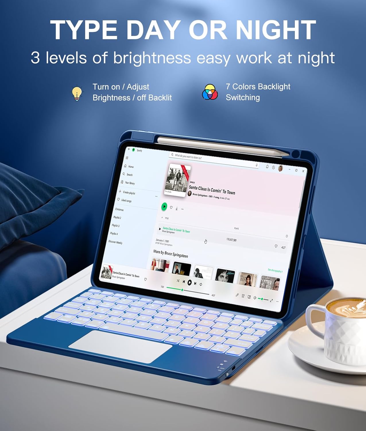 - â€ăIlluminated TypingăEnjoy hassle-free setup with quick and easy BT pairing. Click âFn + Câ to connect the keyboard to your tablet in seconds and start typing immediately. Work comfortably in any lighting condition with the 7-color backlit keyboard. Customize your experience with seven vibrant colors and three brightness levels, perfect for late-night work sessions or dimly lit environments.
