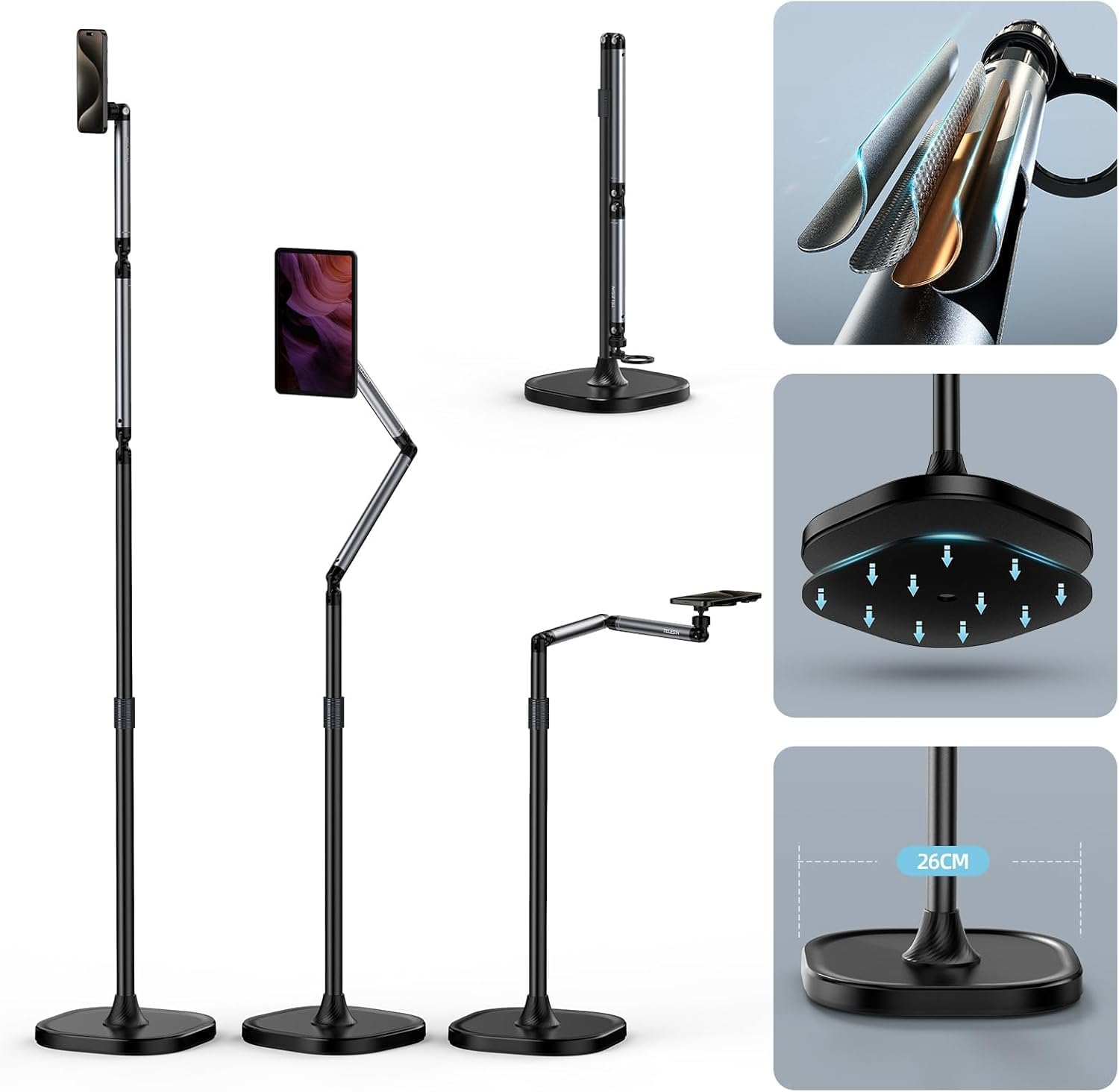 - 1.6M Extension with Wide View: This tablet floor stand is designed with segmented aluminum alloy rod, and 0.6M-1.6M flexible and adjustable, the height is under your control. Meanwhile, the knob has a diamond pattern design, high-end texture to enhance your shooting experience!