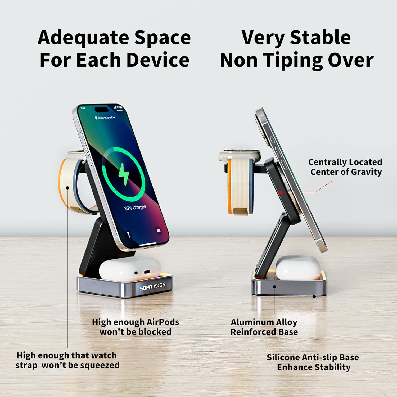 2025 Upgraded 3-in-1 Magnetic Wireless Charger,Charging Stand,Charging Station,for iPhone 12-16,iWatch,AirPods,Ultra-Safe, Foldable, with Adjustable Night Light & Included Adapter