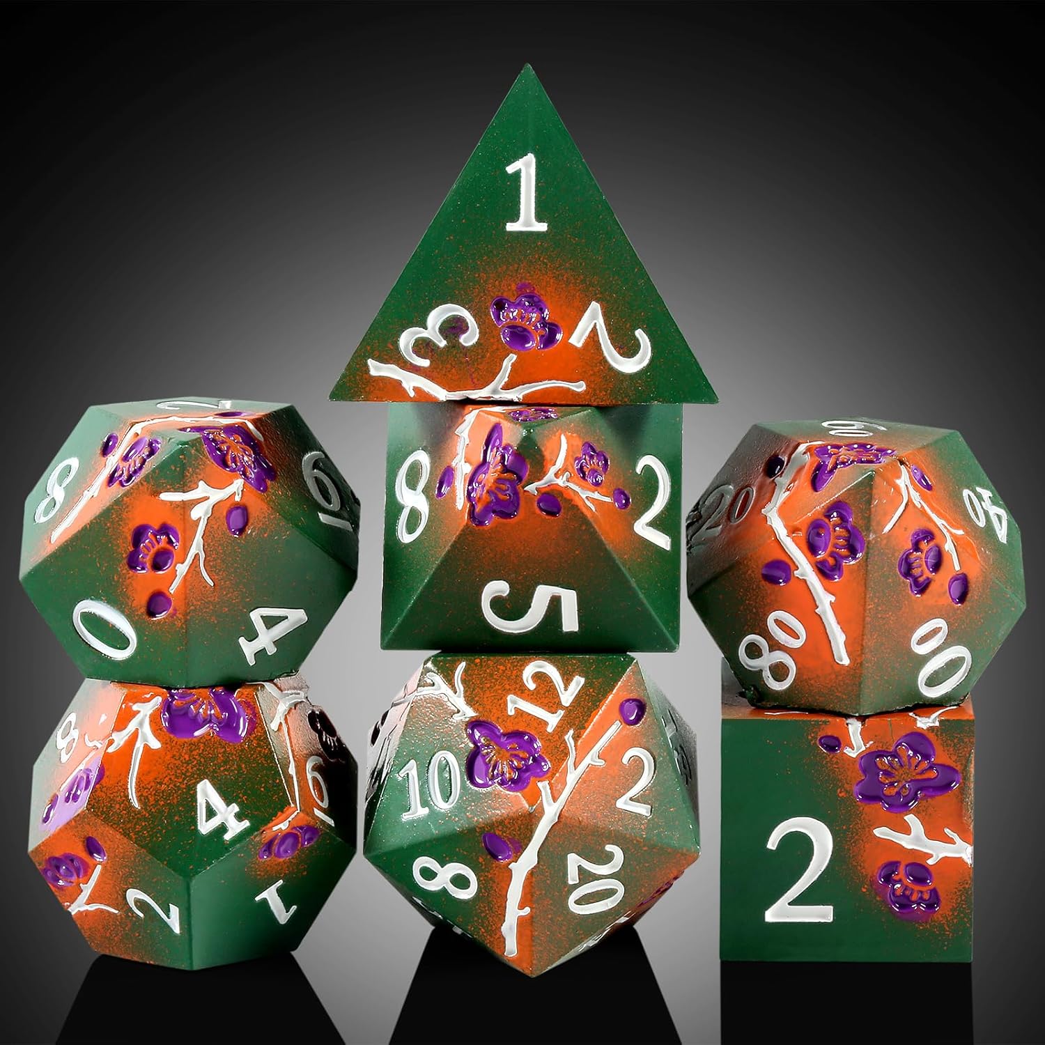 - Color:Double colors army green and orange metal dice with promises a stunning effect,which is sure to stand out on the table,the design is perfect for D&D character.