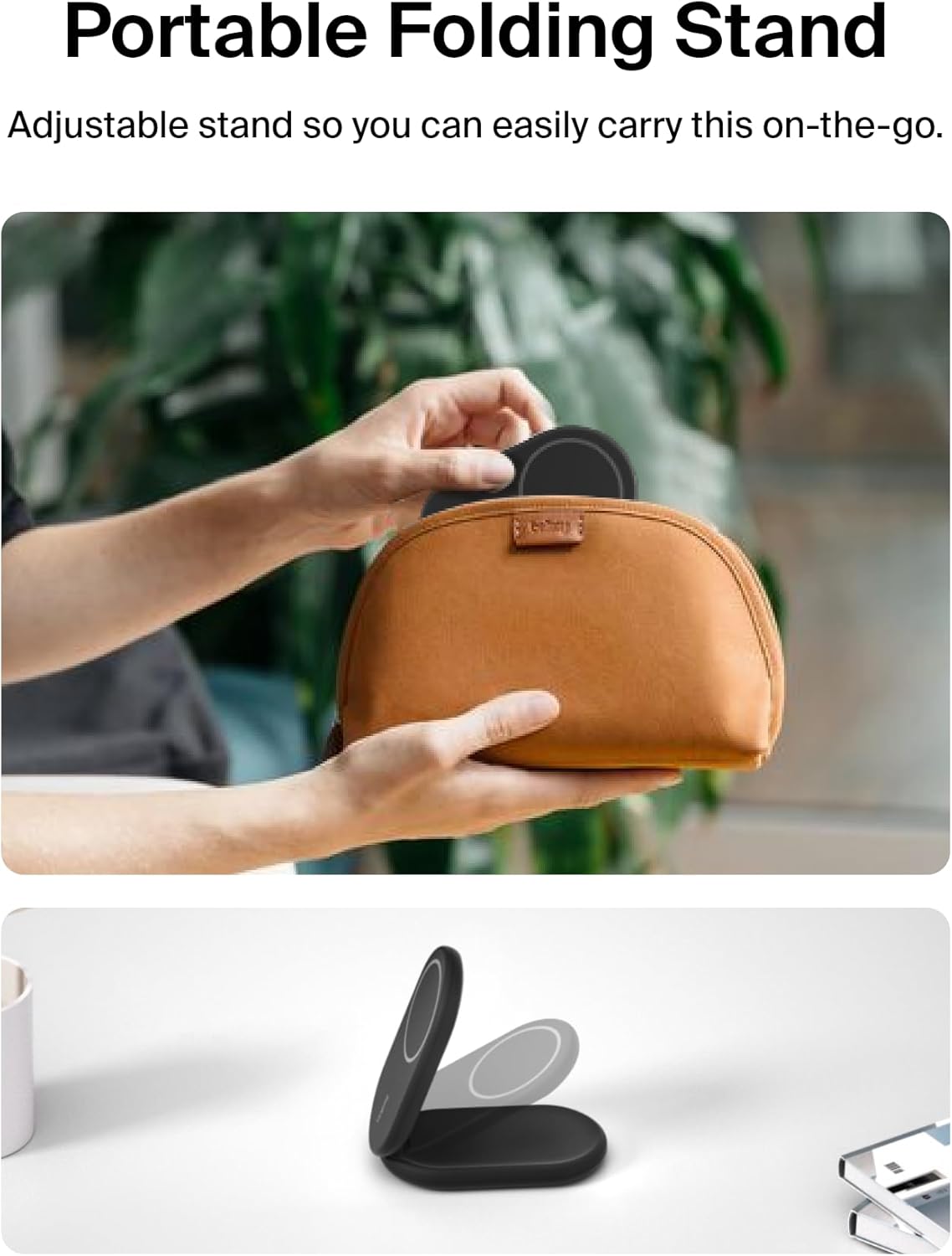 Belkin MagSafe-Compatible Charger, 2-in-1 Magnetic Foldable Charger 15W - Qi2-Certified Wireless Charging for Apple iPhone 16, Apple Watch, Samsung Galaxy S25 w/Non-Slip Base, PSU Included - Black